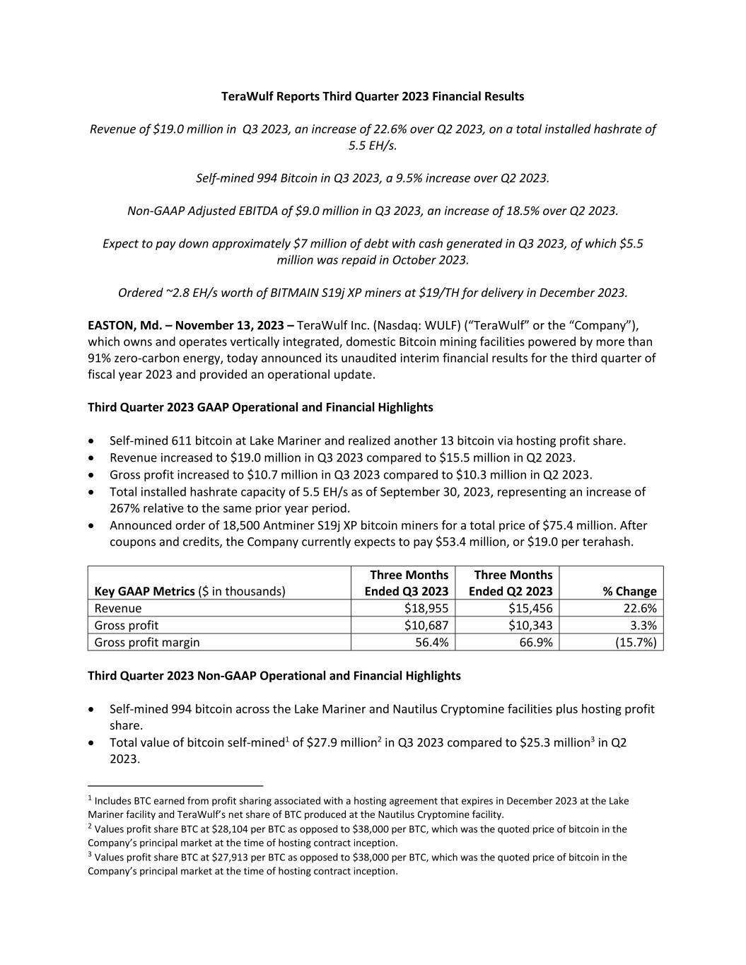 TeraWulf Reports Third Quarter 2023 Financial Results Revenue of $19.0 million in Q3 2023, an increase of 22.6% over Q2 2023, on a total installed hashrate of 5.5 EH/s. Self-mined 994 Bitcoin in Q3 2023, a 9.5% increase over Q2 2023. Non-GAAP Adjusted EBITDA of $9.0 million in Q3 2023, an increase of 18.5% over Q2 2023. Expect to pay down approximately $7 million of debt with cash generated in Q3 2023, of which $5.5 million was repaid in October 2023. Ordered ~2.8 EH/s worth of BITMAIN S19j XP miners at $19/TH for delivery in December 2023. EASTON, Md. – November 13, 2023 – TeraWulf Inc. (Nasdaq: WULF) (“TeraWulf” or the “Company”), which owns and operates vertically integrated, domestic Bitcoin mining facilities powered by more than 91% zero-carbon energy, today announced its unaudited interim financial results for the third quarter of fiscal year 2023 and provided an operational update. Third Quarter 2023 GAAP Operational and Financial Highlights • Self-mined 611 bitcoin at Lake Mariner and realized another 13 bitcoin via hosting profit share. • Revenue increased to $19.0 million in Q3 2023 compared to $15.5 million in Q2 2023. • Gross profit increased to $10.7 million in Q3 2023 compared to $10.3 million in Q2 2023. • Total installed hashrate capacity of 5.5 EH/s as of September 30, 2023, representing an increase of 267% relative to the same prior year period. • Announced order of 18,500 Antminer S19j XP bitcoin miners for a total price of $75.4 million. After coupons and credits, the Company currently expects to pay $53.4 million, or $19.0 per terahash. Key GAAP Metrics ($ in thousands) Three Months Ended Q3 2023 Three Months Ended Q2 2023 % Change Revenue $18,955 $15,456 22.6% Gross profit $10,687 $10,343 3.3% Gross profit margin 56.4% 66.9% (15.7%) Third Quarter 2023 Non-GAAP Operational and Financial Highlights • Self-mined 994 bitcoin across the Lake Mariner and Nautilus Cryptomine facilities plus hosting profit share. • Total value of bitcoin self-mined1 of $27.9 million2 in Q3 2023 compared to $25.3 million3 in Q2 2023. 1 Includes BTC earned from profit sharing associated with a hosting agreement that expires in December 2023 at the Lake Mariner facility and TeraWulf’s net share of BTC produced at the Nautilus Cryptomine facility. 2 Values profit share BTC at $28,104 per BTC as opposed to $38,000 per BTC, which was the quoted price of bitcoin in the Company’s principal market at the time of hosting contract inception. 3 Values profit share BTC at $27,913 per BTC as opposed to $38,000 per BTC, which was the quoted price of bitcoin in the Company’s principal market at the time of hosting contract inception.