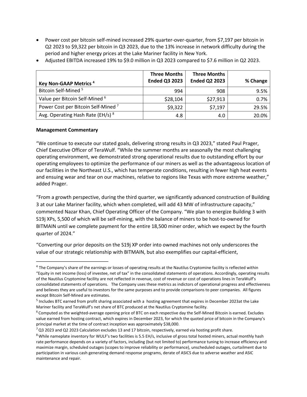 • Power cost per bitcoin self-mined increased 29% quarter-over-quarter, from $7,197 per bitcoin in Q2 2023 to $9,322 per bitcoin in Q3 2023, due to the 13% increase in network difficulty during the period and higher energy prices at the Lake Mariner facility in New York. • Adjusted EBITDA increased 19% to $9.0 million in Q3 2023 compared to $7.6 million in Q2 2023. Key Non-GAAP Metrics 4 Three Months Ended Q3 2023 Three Months Ended Q2 2023 % Change Bitcoin Self-Mined 5 994 908 9.5% Value per Bitcoin Self-Mined 6 $28,104 $27,913 0.7% Power Cost per Bitcoin Self-Mined 7 $9,322 $7,197 29.5% Avg. Operating Hash Rate (EH/s) 8 4.8 4.0 20.0% Management Commentary “We continue to execute our stated goals, delivering strong results in Q3 2023,” stated Paul Prager, Chief Executive Officer of TeraWulf. “While the summer months are seasonally the most challenging operating environment, we demonstrated strong operational results due to outstanding effort by our operating employees to optimize the performance of our miners as well as the advantageous location of our facilities in the Northeast U.S., which has temperate conditions, resulting in fewer high heat events and ensuing wear and tear on our machines, relative to regions like Texas with more extreme weather,” added Prager. “From a growth perspective, during the third quarter, we significantly advanced construction of Building 3 at our Lake Mariner facility, which when completed, will add 43 MW of infrastructure capacity,” commented Nazar Khan, Chief Operating Officer of the Company. “We plan to energize Building 3 with S19j XPs, 5,500 of which will be self-mining, with the balance of miners to be host-to-owned for BITMAIN until we complete payment for the entire 18,500 miner order, which we expect by the fourth quarter of 2024.” “Converting our prior deposits on the S19j XP order into owned machines not only underscores the value of our strategic relationship with BITMAIN, but also exemplifies our capital-efficient, 4 The Company’s share of the earnings or losses of operating results at the Nautilus Cryptomine facility is reflected within “Equity in net income (loss) of investee, net of tax” in the consolidated statements of operations. Accordingly, operating results of the Nautilus Cryptomine facility are not reflected in revenue, cost of revenue or cost of operations lines in TeraWulf’s consolidated statements of operations. The Company uses these metrics as indictors of operational progress and effectiveness and believes they are useful to investors for the same purposes and to provide comparisons to peer companies. All figures except Bitcoin Self-Mined are estimates. 5 Includes BTC earned from profit sharing associated with a hosting agreement that expires in December 2023at the Lake Mariner facility and TeraWulf’s net share of BTC produced at the Nautilus Cryptomine facility. 6 Computed as the weighted-average opening price of BTC on each respective day the Self-Mined Bitcoin is earned. Excludes value earned from hosting contract, which expires in December 2023, for which the quoted price of bitcoin in the Company’s principal market at the time of contract inception was approximately $38,000. 7 Q3 2023 and Q2 2023 Calculation excludes 13 and 17 bitcoin, respectively, earned via hosting profit share. 8 While nameplate inventory for WULF’s two facilities is 5.5 EH/s, inclusive of gross total hosted miners, actual monthly hash rate performance depends on a variety of factors, including (but not limited to) performance tuning to increase efficiency and maximize margin, scheduled outages (scopes to improve reliability or performance), unscheduled outages, curtailment due to participation in various cash generating demand response programs, derate of ASICS due to adverse weather and ASIC maintenance and repair.