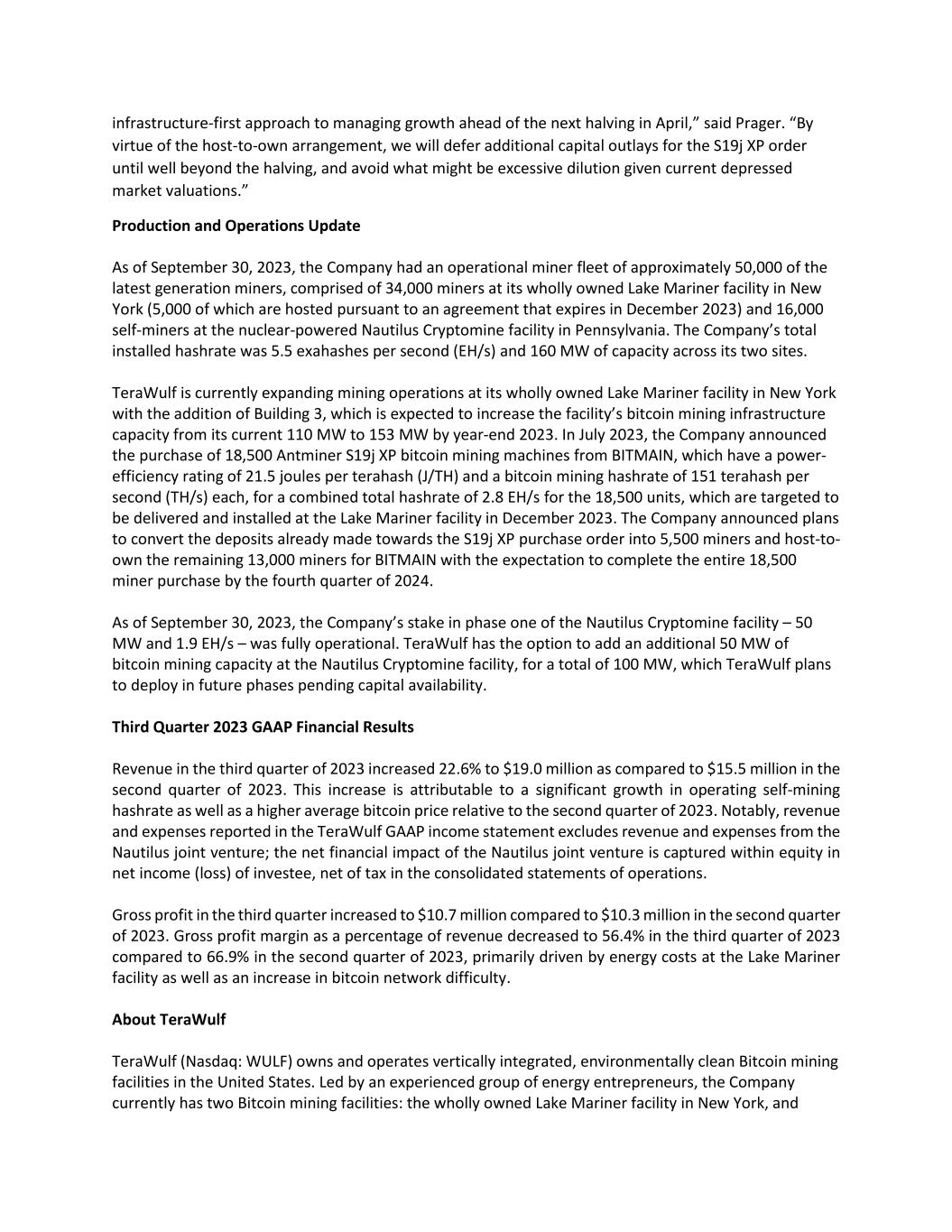 infrastructure-first approach to managing growth ahead of the next halving in April,” said Prager. “By virtue of the host-to-own arrangement, we will defer additional capital outlays for the S19j XP order until well beyond the halving, and avoid what might be excessive dilution given current depressed market valuations.” Production and Operations Update As of September 30, 2023, the Company had an operational miner fleet of approximately 50,000 of the latest generation miners, comprised of 34,000 miners at its wholly owned Lake Mariner facility in New York (5,000 of which are hosted pursuant to an agreement that expires in December 2023) and 16,000 self-miners at the nuclear-powered Nautilus Cryptomine facility in Pennsylvania. The Company’s total installed hashrate was 5.5 exahashes per second (EH/s) and 160 MW of capacity across its two sites. TeraWulf is currently expanding mining operations at its wholly owned Lake Mariner facility in New York with the addition of Building 3, which is expected to increase the facility’s bitcoin mining infrastructure capacity from its current 110 MW to 153 MW by year-end 2023. In July 2023, the Company announced the purchase of 18,500 Antminer S19j XP bitcoin mining machines from BITMAIN, which have a power- efficiency rating of 21.5 joules per terahash (J/TH) and a bitcoin mining hashrate of 151 terahash per second (TH/s) each, for a combined total hashrate of 2.8 EH/s for the 18,500 units, which are targeted to be delivered and installed at the Lake Mariner facility in December 2023. The Company announced plans to convert the deposits already made towards the S19j XP purchase order into 5,500 miners and host-to- own the remaining 13,000 miners for BITMAIN with the expectation to complete the entire 18,500 miner purchase by the fourth quarter of 2024. As of September 30, 2023, the Company’s stake in phase one of the Nautilus Cryptomine facility – 50 MW and 1.9 EH/s – was fully operational. TeraWulf has the option to add an additional 50 MW of bitcoin mining capacity at the Nautilus Cryptomine facility, for a total of 100 MW, which TeraWulf plans to deploy in future phases pending capital availability. Third Quarter 2023 GAAP Financial Results Revenue in the third quarter of 2023 increased 22.6% to $19.0 million as compared to $15.5 million in the second quarter of 2023. This increase is attributable to a significant growth in operating self-mining hashrate as well as a higher average bitcoin price relative to the second quarter of 2023. Notably, revenue and expenses reported in the TeraWulf GAAP income statement excludes revenue and expenses from the Nautilus joint venture; the net financial impact of the Nautilus joint venture is captured within equity in net income (loss) of investee, net of tax in the consolidated statements of operations. Gross profit in the third quarter increased to $10.7 million compared to $10.3 million in the second quarter of 2023. Gross profit margin as a percentage of revenue decreased to 56.4% in the third quarter of 2023 compared to 66.9% in the second quarter of 2023, primarily driven by energy costs at the Lake Mariner facility as well as an increase in bitcoin network difficulty. About TeraWulf TeraWulf (Nasdaq: WULF) owns and operates vertically integrated, environmentally clean Bitcoin mining facilities in the United States. Led by an experienced group of energy entrepreneurs, the Company currently has two Bitcoin mining facilities: the wholly owned Lake Mariner facility in New York, and