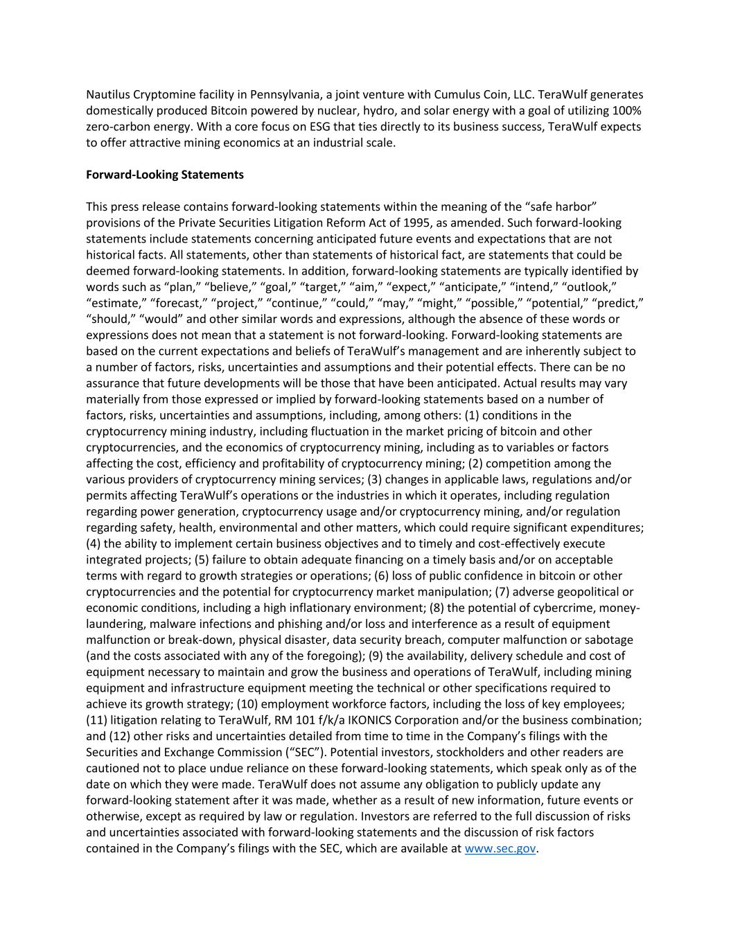 Nautilus Cryptomine facility in Pennsylvania, a joint venture with Cumulus Coin, LLC. TeraWulf generates domestically produced Bitcoin powered by nuclear, hydro, and solar energy with a goal of utilizing 100% zero-carbon energy. With a core focus on ESG that ties directly to its business success, TeraWulf expects to offer attractive mining economics at an industrial scale. Forward-Looking Statements This press release contains forward-looking statements within the meaning of the “safe harbor” provisions of the Private Securities Litigation Reform Act of 1995, as amended. Such forward-looking statements include statements concerning anticipated future events and expectations that are not historical facts. All statements, other than statements of historical fact, are statements that could be deemed forward-looking statements. In addition, forward-looking statements are typically identified by words such as “plan,” “believe,” “goal,” “target,” “aim,” “expect,” “anticipate,” “intend,” “outlook,” “estimate,” “forecast,” “project,” “continue,” “could,” “may,” “might,” “possible,” “potential,” “predict,” “should,” “would” and other similar words and expressions, although the absence of these words or expressions does not mean that a statement is not forward-looking. Forward-looking statements are based on the current expectations and beliefs of TeraWulf’s management and are inherently subject to a number of factors, risks, uncertainties and assumptions and their potential effects. There can be no assurance that future developments will be those that have been anticipated. Actual results may vary materially from those expressed or implied by forward-looking statements based on a number of factors, risks, uncertainties and assumptions, including, among others: (1) conditions in the cryptocurrency mining industry, including fluctuation in the market pricing of bitcoin and other cryptocurrencies, and the economics of cryptocurrency mining, including as to variables or factors affecting the cost, efficiency and profitability of cryptocurrency mining; (2) competition among the various providers of cryptocurrency mining services; (3) changes in applicable laws, regulations and/or permits affecting TeraWulf’s operations or the industries in which it operates, including regulation regarding power generation, cryptocurrency usage and/or cryptocurrency mining, and/or regulation regarding safety, health, environmental and other matters, which could require significant expenditures; (4) the ability to implement certain business objectives and to timely and cost-effectively execute integrated projects; (5) failure to obtain adequate financing on a timely basis and/or on acceptable terms with regard to growth strategies or operations; (6) loss of public confidence in bitcoin or other cryptocurrencies and the potential for cryptocurrency market manipulation; (7) adverse geopolitical or economic conditions, including a high inflationary environment; (8) the potential of cybercrime, money- laundering, malware infections and phishing and/or loss and interference as a result of equipment malfunction or break-down, physical disaster, data security breach, computer malfunction or sabotage (and the costs associated with any of the foregoing); (9) the availability, delivery schedule and cost of equipment necessary to maintain and grow the business and operations of TeraWulf, including mining equipment and infrastructure equipment meeting the technical or other specifications required to achieve its growth strategy; (10) employment workforce factors, including the loss of key employees; (11) litigation relating to TeraWulf, RM 101 f/k/a IKONICS Corporation and/or the business combination; and (12) other risks and uncertainties detailed from time to time in the Company’s filings with the Securities and Exchange Commission (“SEC”). Potential investors, stockholders and other readers are cautioned not to place undue reliance on these forward-looking statements, which speak only as of the date on which they were made. TeraWulf does not assume any obligation to publicly update any forward-looking statement after it was made, whether as a result of new information, future events or otherwise, except as required by law or regulation. Investors are referred to the full discussion of risks and uncertainties associated with forward-looking statements and the discussion of risk factors contained in the Company’s filings with the SEC, which are available at www.sec.gov.