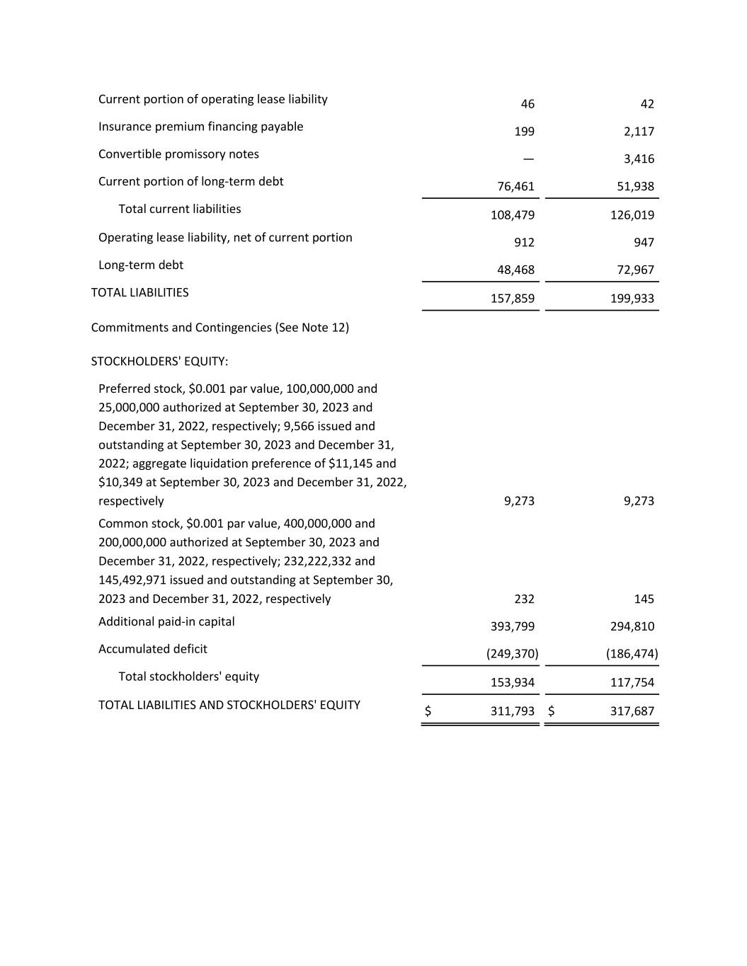 Current portion of operating lease liability 46 42 Insurance premium financing payable 199 2,117 Convertible promissory notes — 3,416 Current portion of long-term debt 76,461 51,938 Total current liabilities 108,479 126,019 Operating lease liability, net of current portion 912 947 Long-term debt 48,468 72,967 TOTAL LIABILITIES 157,859 199,933 Commitments and Contingencies (See Note 12) STOCKHOLDERS' EQUITY: Preferred stock, $0.001 par value, 100,000,000 and 25,000,000 authorized at September 30, 2023 and December 31, 2022, respectively; 9,566 issued and outstanding at September 30, 2023 and December 31, 2022; aggregate liquidation preference of $11,145 and $10,349 at September 30, 2023 and December 31, 2022, respectively 9,273 9,273 Common stock, $0.001 par value, 400,000,000 and 200,000,000 authorized at September 30, 2023 and December 31, 2022, respectively; 232,222,332 and 145,492,971 issued and outstanding at September 30, 2023 and December 31, 2022, respectively 232 145 Additional paid-in capital 393,799 294,810 Accumulated deficit (249,370) (186,474) Total stockholders' equity 153,934 117,754 TOTAL LIABILITIES AND STOCKHOLDERS' EQUITY $ 311,793 $ 317,687
