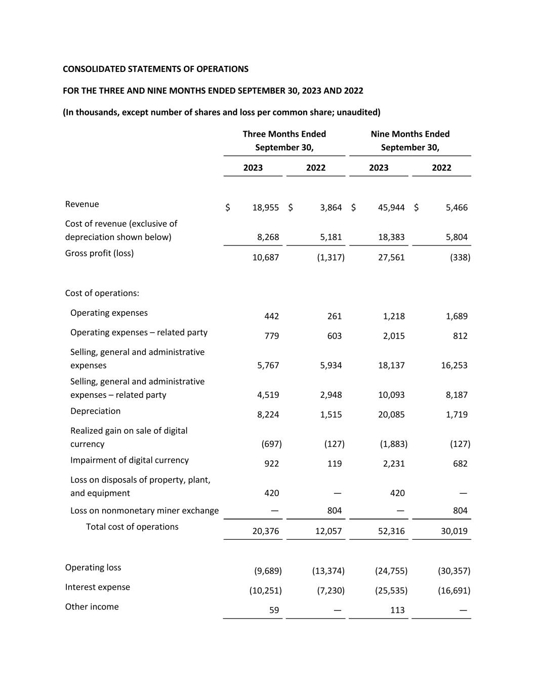 CONSOLIDATED STATEMENTS OF OPERATIONS FOR THE THREE AND NINE MONTHS ENDED SEPTEMBER 30, 2023 AND 2022 (In thousands, except number of shares and loss per common share; unaudited) Three Months Ended September 30, Nine Months Ended September 30, 2023 2022 2023 2022 Revenue $ 18,955 $ 3,864 $ 45,944 $ 5,466 Cost of revenue (exclusive of depreciation shown below) 8,268 5,181 18,383 5,804 Gross profit (loss) 10,687 (1,317) 27,561 (338) Cost of operations: Operating expenses 442 261 1,218 1,689 Operating expenses – related party 779 603 2,015 812 Selling, general and administrative expenses 5,767 5,934 18,137 16,253 Selling, general and administrative expenses – related party 4,519 2,948 10,093 8,187 Depreciation 8,224 1,515 20,085 1,719 Realized gain on sale of digital currency (697) (127) (1,883) (127) Impairment of digital currency 922 119 2,231 682 Loss on disposals of property, plant, and equipment 420 — 420 — Loss on nonmonetary miner exchange — 804 — 804 Total cost of operations 20,376 12,057 52,316 30,019 Operating loss (9,689) (13,374) (24,755) (30,357) Interest expense (10,251) (7,230) (25,535) (16,691) Other income 59 — 113 —