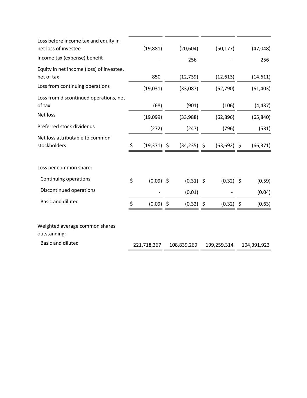 Loss before income tax and equity in net loss of investee (19,881) (20,604) (50,177) (47,048) Income tax (expense) benefit — 256 — 256 Equity in net income (loss) of investee, net of tax 850 (12,739) (12,613) (14,611) Loss from continuing operations (19,031) (33,087) (62,790) (61,403) Loss from discontinued operations, net of tax (68) (901) (106) (4,437) Net loss (19,099) (33,988) (62,896) (65,840) Preferred stock dividends (272) (247) (796) (531) Net loss attributable to common stockholders $ (19,371) $ (34,235) $ (63,692) $ (66,371) Loss per common share: Continuing operations $ (0.09) $ (0.31) $ (0.32) $ (0.59) Discontinued operations - (0.01) - (0.04) Basic and diluted $ (0.09) $ (0.32) $ (0.32) $ (0.63) Weighted average common shares outstanding: Basic and diluted 221,718,367 108,839,269 199,259,314 104,391,923