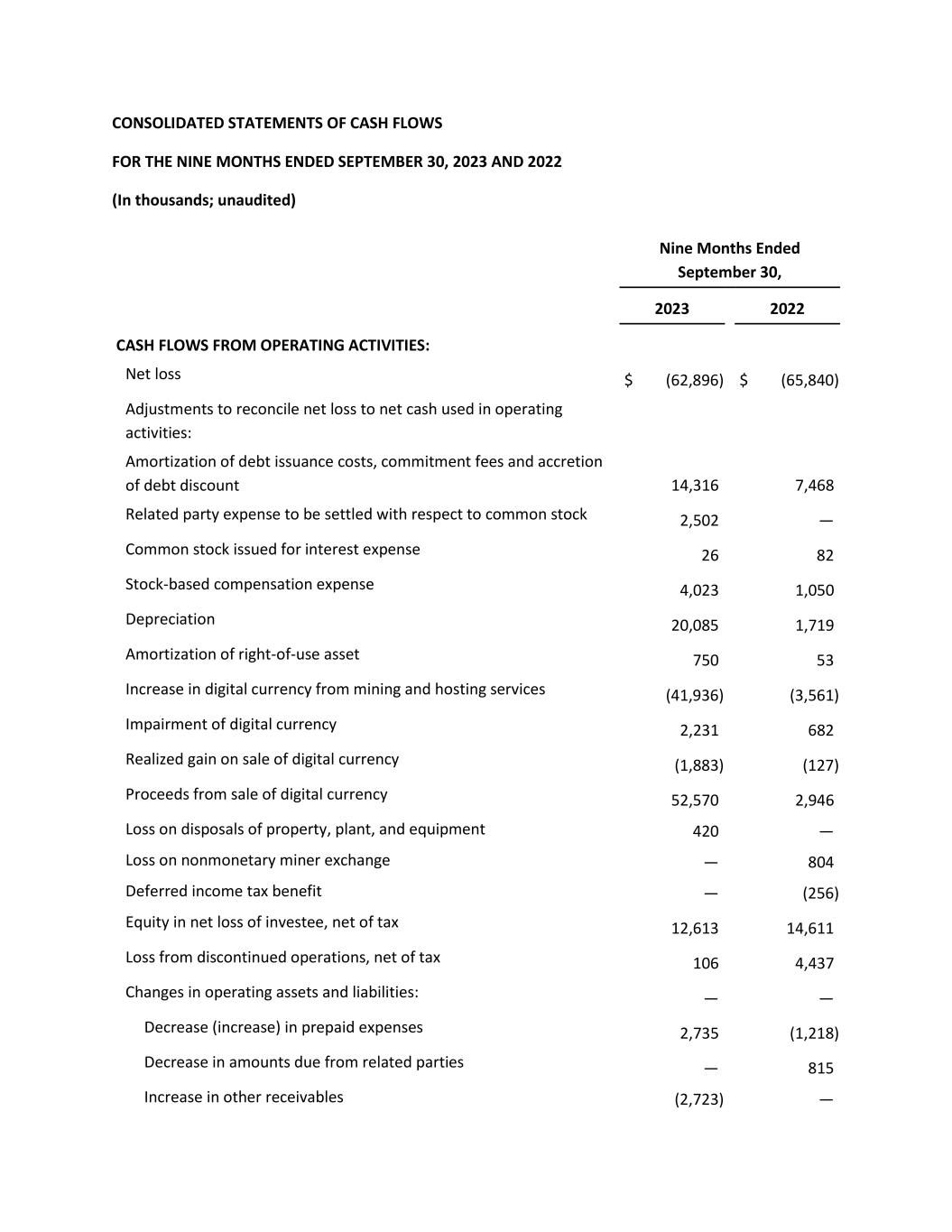 CONSOLIDATED STATEMENTS OF CASH FLOWS FOR THE NINE MONTHS ENDED SEPTEMBER 30, 2023 AND 2022 (In thousands; unaudited) Nine Months Ended September 30, 2023 2022 CASH FLOWS FROM OPERATING ACTIVITIES: Net loss $ (62,896) $ (65,840) Adjustments to reconcile net loss to net cash used in operating activities: Amortization of debt issuance costs, commitment fees and accretion of debt discount 14,316 7,468 Related party expense to be settled with respect to common stock 2,502 — Common stock issued for interest expense 26 82 Stock-based compensation expense 4,023 1,050 Depreciation 20,085 1,719 Amortization of right-of-use asset 750 53 Increase in digital currency from mining and hosting services (41,936) (3,561) Impairment of digital currency 2,231 682 Realized gain on sale of digital currency (1,883) (127) Proceeds from sale of digital currency 52,570 2,946 Loss on disposals of property, plant, and equipment 420 — Loss on nonmonetary miner exchange — 804 Deferred income tax benefit — (256) Equity in net loss of investee, net of tax 12,613 14,611 Loss from discontinued operations, net of tax 106 4,437 Changes in operating assets and liabilities: — — Decrease (increase) in prepaid expenses 2,735 (1,218) Decrease in amounts due from related parties — 815 Increase in other receivables (2,723) —