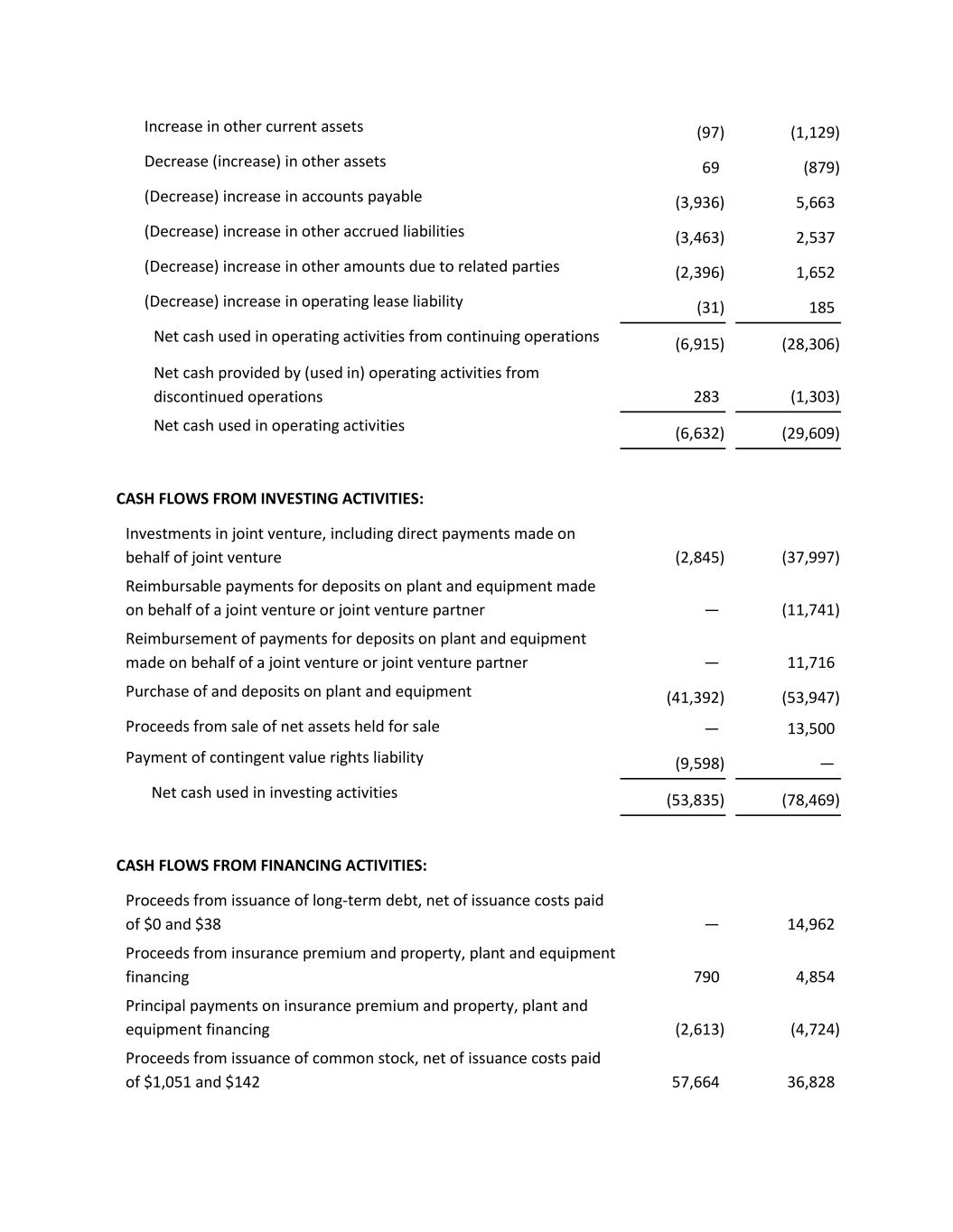 Increase in other current assets (97) (1,129) Decrease (increase) in other assets 69 (879) (Decrease) increase in accounts payable (3,936) 5,663 (Decrease) increase in other accrued liabilities (3,463) 2,537 (Decrease) increase in other amounts due to related parties (2,396) 1,652 (Decrease) increase in operating lease liability (31) 185 Net cash used in operating activities from continuing operations (6,915) (28,306) Net cash provided by (used in) operating activities from discontinued operations 283 (1,303) Net cash used in operating activities (6,632) (29,609) CASH FLOWS FROM INVESTING ACTIVITIES: Investments in joint venture, including direct payments made on behalf of joint venture (2,845) (37,997) Reimbursable payments for deposits on plant and equipment made on behalf of a joint venture or joint venture partner — (11,741) Reimbursement of payments for deposits on plant and equipment made on behalf of a joint venture or joint venture partner — 11,716 Purchase of and deposits on plant and equipment (41,392) (53,947) Proceeds from sale of net assets held for sale — 13,500 Payment of contingent value rights liability (9,598) — Net cash used in investing activities (53,835) (78,469) CASH FLOWS FROM FINANCING ACTIVITIES: Proceeds from issuance of long-term debt, net of issuance costs paid of $0 and $38 — 14,962 Proceeds from insurance premium and property, plant and equipment financing 790 4,854 Principal payments on insurance premium and property, plant and equipment financing (2,613) (4,724) Proceeds from issuance of common stock, net of issuance costs paid of $1,051 and $142 57,664 36,828