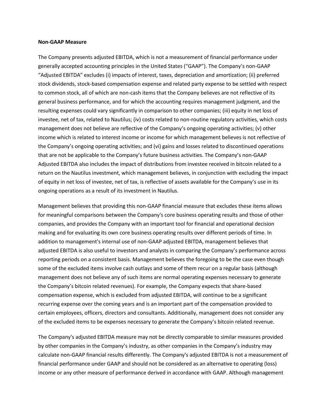 Non-GAAP Measure The Company presents adjusted EBITDA, which is not a measurement of financial performance under generally accepted accounting principles in the United States (“GAAP”). The Company’s non-GAAP “Adjusted EBITDA” excludes (i) impacts of interest, taxes, depreciation and amortization; (ii) preferred stock dividends, stock-based compensation expense and related party expense to be settled with respect to common stock, all of which are non-cash items that the Company believes are not reflective of its general business performance, and for which the accounting requires management judgment, and the resulting expenses could vary significantly in comparison to other companies; (iii) equity in net loss of investee, net of tax, related to Nautilus; (iv) costs related to non-routine regulatory activities, which costs management does not believe are reflective of the Company’s ongoing operating activities; (v) other income which is related to interest income or income for which management believes is not reflective of the Company’s ongoing operating activities; and (vi) gains and losses related to discontinued operations that are not be applicable to the Company’s future business activities. The Company’s non-GAAP Adjusted EBITDA also includes the impact of distributions from investee received in bitcoin related to a return on the Nautilus investment, which management believes, in conjunction with excluding the impact of equity in net loss of investee, net of tax, is reflective of assets available for the Company’s use in its ongoing operations as a result of its investment in Nautilus. Management believes that providing this non-GAAP financial measure that excludes these items allows for meaningful comparisons between the Company's core business operating results and those of other companies, and provides the Company with an important tool for financial and operational decision making and for evaluating its own core business operating results over different periods of time. In addition to management's internal use of non-GAAP adjusted EBITDA, management believes that adjusted EBITDA is also useful to investors and analysts in comparing the Company’s performance across reporting periods on a consistent basis. Management believes the foregoing to be the case even though some of the excluded items involve cash outlays and some of them recur on a regular basis (although management does not believe any of such items are normal operating expenses necessary to generate the Company’s bitcoin related revenues). For example, the Company expects that share-based compensation expense, which is excluded from adjusted EBITDA, will continue to be a significant recurring expense over the coming years and is an important part of the compensation provided to certain employees, officers, directors and consultants. Additionally, management does not consider any of the excluded items to be expenses necessary to generate the Company’s bitcoin related revenue. The Company's adjusted EBITDA measure may not be directly comparable to similar measures provided by other companies in the Company’s industry, as other companies in the Company’s industry may calculate non-GAAP financial results differently. The Company's adjusted EBITDA is not a measurement of financial performance under GAAP and should not be considered as an alternative to operating (loss) income or any other measure of performance derived in accordance with GAAP. Although management