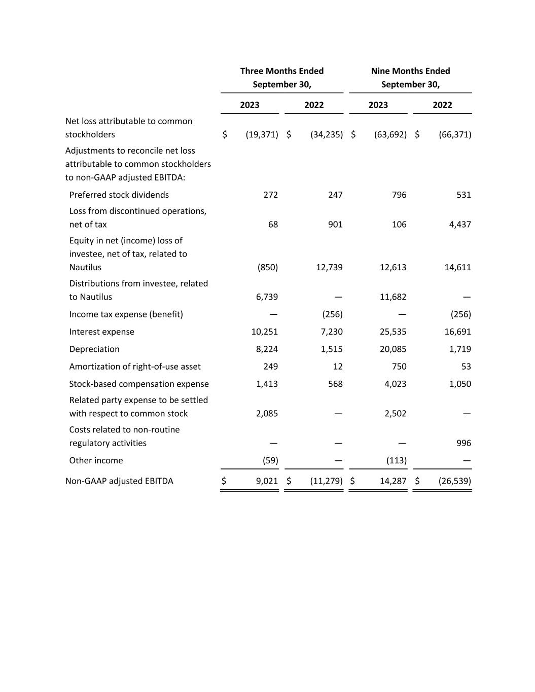 Three Months Ended September 30, Nine Months Ended September 30, 2023 2022 2023 2022 Net loss attributable to common stockholders $ (19,371) $ (34,235) $ (63,692) $ (66,371) Adjustments to reconcile net loss attributable to common stockholders to non-GAAP adjusted EBITDA: Preferred stock dividends 272 247 796 531 Loss from discontinued operations, net of tax 68 901 106 4,437 Equity in net (income) loss of investee, net of tax, related to Nautilus (850) 12,739 12,613 14,611 Distributions from investee, related to Nautilus 6,739 — 11,682 — Income tax expense (benefit) — (256) — (256) Interest expense 10,251 7,230 25,535 16,691 Depreciation 8,224 1,515 20,085 1,719 Amortization of right-of-use asset 249 12 750 53 Stock-based compensation expense 1,413 568 4,023 1,050 Related party expense to be settled with respect to common stock 2,085 — 2,502 — Costs related to non-routine regulatory activities — — — 996 Other income (59) — (113) — Non-GAAP adjusted EBITDA $ 9,021 $ (11,279) $ 14,287 $ (26,539)