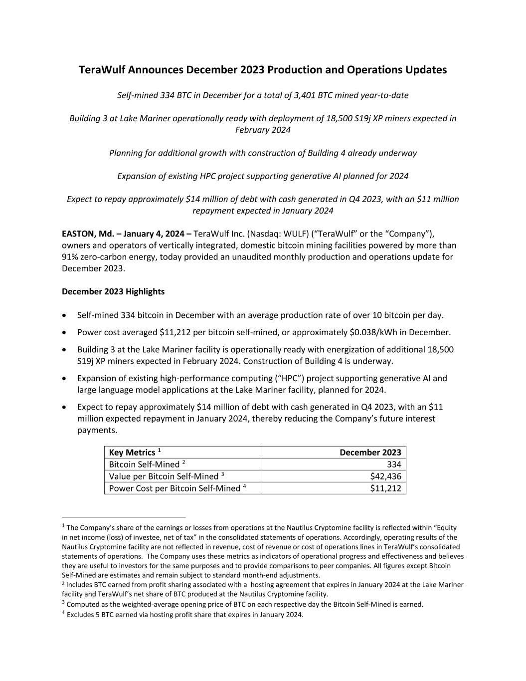 TeraWulf Announces December 2023 Production and Operations Updates Self-mined 334 BTC in December for a total of 3,401 BTC mined year-to-date Building 3 at Lake Mariner operationally ready with deployment of 18,500 S19j XP miners expected in February 2024 Planning for additional growth with construction of Building 4 already underway Expansion of existing HPC project supporting generative AI planned for 2024 Expect to repay approximately $14 million of debt with cash generated in Q4 2023, with an $11 million repayment expected in January 2024 EASTON, Md. – January 4, 2024 – TeraWulf Inc. (Nasdaq: WULF) (“TeraWulf” or the “Company”), owners and operators of vertically integrated, domestic bitcoin mining facilities powered by more than 91% zero-carbon energy, today provided an unaudited monthly production and operations update for December 2023. December 2023 Highlights • Self-mined 334 bitcoin in December with an average production rate of over 10 bitcoin per day. • Power cost averaged $11,212 per bitcoin self-mined, or approximately $0.038/kWh in December. • Building 3 at the Lake Mariner facility is operationally ready with energization of additional 18,500 S19j XP miners expected in February 2024. Construction of Building 4 is underway. • Expansion of existing high-performance computing (“HPC”) project supporting generative AI and large language model applications at the Lake Mariner facility, planned for 2024. • Expect to repay approximately $14 million of debt with cash generated in Q4 2023, with an $11 million expected repayment in January 2024, thereby reducing the Company’s future interest payments. Key Metrics 1 December 2023 Bitcoin Self-Mined 2 334 Value per Bitcoin Self-Mined 3 $42,436 Power Cost per Bitcoin Self-Mined 4 $11,212 1 The Company’s share of the earnings or losses from operations at the Nautilus Cryptomine facility is reflected within “Equity in net income (loss) of investee, net of tax” in the consolidated statements of operations. Accordingly, operating results of the Nautilus Cryptomine facility are not reflected in revenue, cost of revenue or cost of operations lines in TeraWulf’s consolidated statements of operations. The Company uses these metrics as indicators of operational progress and effectiveness and believes they are useful to investors for the same purposes and to provide comparisons to peer companies. All figures except Bitcoin Self-Mined are estimates and remain subject to standard month-end adjustments. 2 Includes BTC earned from profit sharing associated with a hosting agreement that expires in January 2024 at the Lake Mariner facility and TeraWulf’s net share of BTC produced at the Nautilus Cryptomine facility. 3 Computed as the weighted-average opening price of BTC on each respective day the Bitcoin Self-Mined is earned. 4 Excludes 5 BTC earned via hosting profit share that expires in January 2024.