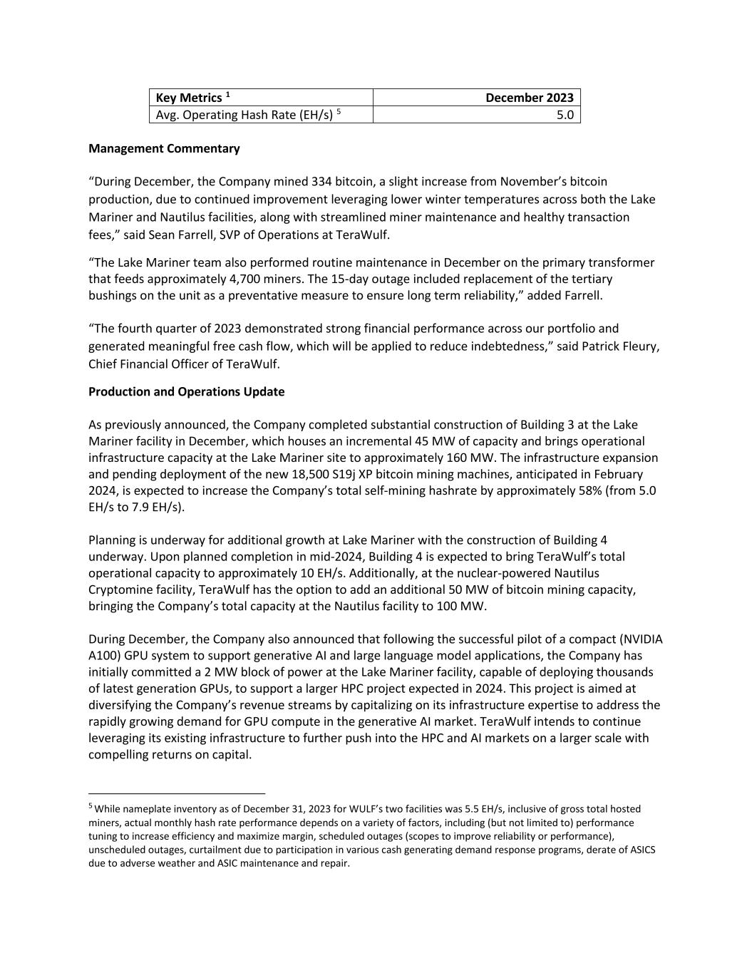 Key Metrics 1 December 2023 Avg. Operating Hash Rate (EH/s) 5 5.0 Management Commentary “During December, the Company mined 334 bitcoin, a slight increase from November’s bitcoin production, due to continued improvement leveraging lower winter temperatures across both the Lake Mariner and Nautilus facilities, along with streamlined miner maintenance and healthy transaction fees,” said Sean Farrell, SVP of Operations at TeraWulf. “The Lake Mariner team also performed routine maintenance in December on the primary transformer that feeds approximately 4,700 miners. The 15-day outage included replacement of the tertiary bushings on the unit as a preventative measure to ensure long term reliability,” added Farrell. “The fourth quarter of 2023 demonstrated strong financial performance across our portfolio and generated meaningful free cash flow, which will be applied to reduce indebtedness,” said Patrick Fleury, Chief Financial Officer of TeraWulf. Production and Operations Update As previously announced, the Company completed substantial construction of Building 3 at the Lake Mariner facility in December, which houses an incremental 45 MW of capacity and brings operational infrastructure capacity at the Lake Mariner site to approximately 160 MW. The infrastructure expansion and pending deployment of the new 18,500 S19j XP bitcoin mining machines, anticipated in February 2024, is expected to increase the Company’s total self-mining hashrate by approximately 58% (from 5.0 EH/s to 7.9 EH/s). Planning is underway for additional growth at Lake Mariner with the construction of Building 4 underway. Upon planned completion in mid-2024, Building 4 is expected to bring TeraWulf’s total operational capacity to approximately 10 EH/s. Additionally, at the nuclear-powered Nautilus Cryptomine facility, TeraWulf has the option to add an additional 50 MW of bitcoin mining capacity, bringing the Company’s total capacity at the Nautilus facility to 100 MW. During December, the Company also announced that following the successful pilot of a compact (NVIDIA A100) GPU system to support generative AI and large language model applications, the Company has initially committed a 2 MW block of power at the Lake Mariner facility, capable of deploying thousands of latest generation GPUs, to support a larger HPC project expected in 2024. This project is aimed at diversifying the Company’s revenue streams by capitalizing on its infrastructure expertise to address the rapidly growing demand for GPU compute in the generative AI market. TeraWulf intends to continue leveraging its existing infrastructure to further push into the HPC and AI markets on a larger scale with compelling returns on capital. 5 While nameplate inventory as of December 31, 2023 for WULF’s two facilities was 5.5 EH/s, inclusive of gross total hosted miners, actual monthly hash rate performance depends on a variety of factors, including (but not limited to) performance tuning to increase efficiency and maximize margin, scheduled outages (scopes to improve reliability or performance), unscheduled outages, curtailment due to participation in various cash generating demand response programs, derate of ASICS due to adverse weather and ASIC maintenance and repair.