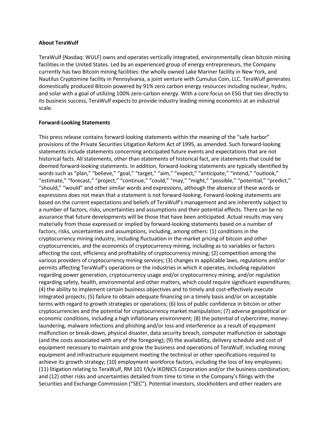 About TeraWulf TeraWulf (Nasdaq: WULF) owns and operates vertically integrated, environmentally clean bitcoin mining facilities in the United States. Led by an experienced group of energy entrepreneurs, the Company currently has two Bitcoin mining facilities: the wholly owned Lake Mariner facility in New York, and Nautilus Cryptomine facility in Pennsylvania, a joint venture with Cumulus Coin, LLC. TeraWulf generates domestically produced Bitcoin powered by 91% zero carbon energy resources including nuclear, hydro, and solar with a goal of utilizing 100% zero-carbon energy. With a core focus on ESG that ties directly to its business success, TeraWulf expects to provide industry leading mining economics at an industrial scale. Forward-Looking Statements This press release contains forward-looking statements within the meaning of the “safe harbor” provisions of the Private Securities Litigation Reform Act of 1995, as amended. Such forward-looking statements include statements concerning anticipated future events and expectations that are not historical facts. All statements, other than statements of historical fact, are statements that could be deemed forward-looking statements. In addition, forward-looking statements are typically identified by words such as “plan,” “believe,” “goal,” “target,” “aim,” “expect,” “anticipate,” “intend,” “outlook,” “estimate,” “forecast,” “project,” “continue,” “could,” “may,” “might,” “possible,” “potential,” “predict,” “should,” “would” and other similar words and expressions, although the absence of these words or expressions does not mean that a statement is not forward-looking. Forward-looking statements are based on the current expectations and beliefs of TeraWulf’s management and are inherently subject to a number of factors, risks, uncertainties and assumptions and their potential effects. There can be no assurance that future developments will be those that have been anticipated. Actual results may vary materially from those expressed or implied by forward-looking statements based on a number of factors, risks, uncertainties and assumptions, including, among others: (1) conditions in the cryptocurrency mining industry, including fluctuation in the market pricing of bitcoin and other cryptocurrencies, and the economics of cryptocurrency mining, including as to variables or factors affecting the cost, efficiency and profitability of cryptocurrency mining; (2) competition among the various providers of cryptocurrency mining services; (3) changes in applicable laws, regulations and/or permits affecting TeraWulf’s operations or the industries in which it operates, including regulation regarding power generation, cryptocurrency usage and/or cryptocurrency mining, and/or regulation regarding safety, health, environmental and other matters, which could require significant expenditures; (4) the ability to implement certain business objectives and to timely and cost-effectively execute integrated projects; (5) failure to obtain adequate financing on a timely basis and/or on acceptable terms with regard to growth strategies or operations; (6) loss of public confidence in bitcoin or other cryptocurrencies and the potential for cryptocurrency market manipulation; (7) adverse geopolitical or economic conditions, including a high inflationary environment; (8) the potential of cybercrime, money- laundering, malware infections and phishing and/or loss and interference as a result of equipment malfunction or break-down, physical disaster, data security breach, computer malfunction or sabotage (and the costs associated with any of the foregoing); (9) the availability, delivery schedule and cost of equipment necessary to maintain and grow the business and operations of TeraWulf, including mining equipment and infrastructure equipment meeting the technical or other specifications required to achieve its growth strategy; (10) employment workforce factors, including the loss of key employees; (11) litigation relating to TeraWulf, RM 101 f/k/a IKONICS Corporation and/or the business combination; and (12) other risks and uncertainties detailed from time to time in the Company’s filings with the Securities and Exchange Commission (“SEC”). Potential investors, stockholders and other readers are