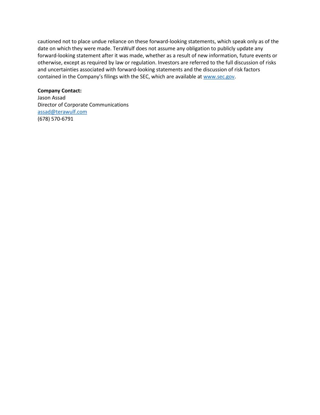 cautioned not to place undue reliance on these forward-looking statements, which speak only as of the date on which they were made. TeraWulf does not assume any obligation to publicly update any forward-looking statement after it was made, whether as a result of new information, future events or otherwise, except as required by law or regulation. Investors are referred to the full discussion of risks and uncertainties associated with forward-looking statements and the discussion of risk factors contained in the Company’s filings with the SEC, which are available at www.sec.gov. Company Contact: Jason Assad Director of Corporate Communications assad@terawulf.com (678) 570-6791