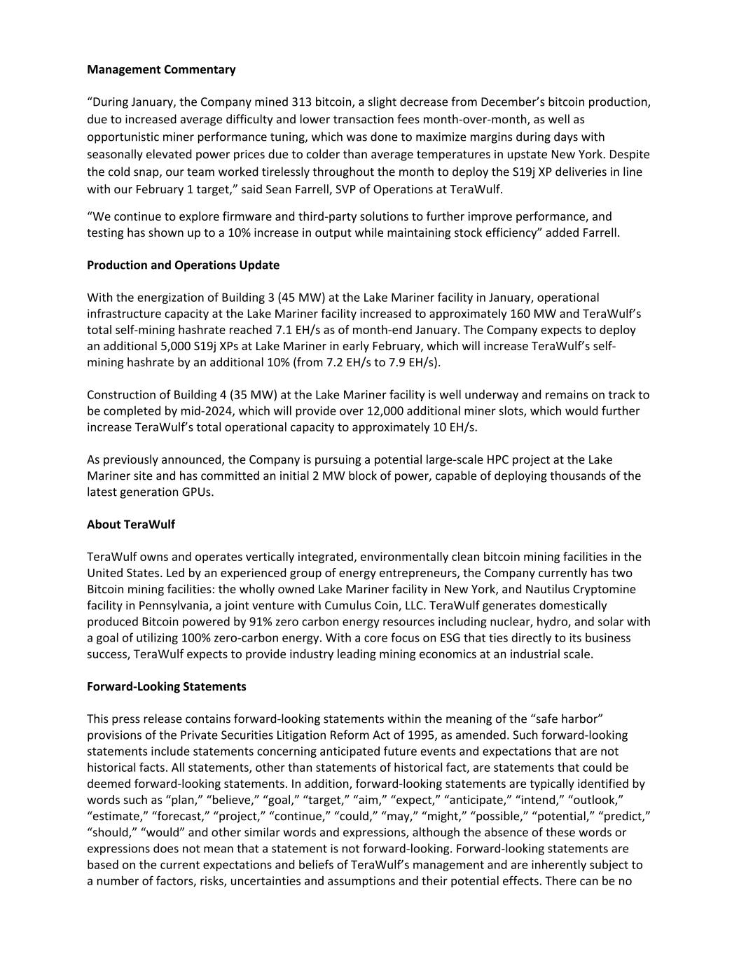 Management Commentary “During January, the Company mined 313 bitcoin, a slight decrease from December’s bitcoin production, due to increased average difficulty and lower transaction fees month‐over‐month, as well as opportunistic miner performance tuning, which was done to maximize margins during days with seasonally elevated power prices due to colder than average temperatures in upstate New York. Despite the cold snap, our team worked tirelessly throughout the month to deploy the S19j XP deliveries in line with our February 1 target,” said Sean Farrell, SVP of Operations at TeraWulf. “We continue to explore firmware and third‐party solutions to further improve performance, and testing has shown up to a 10% increase in output while maintaining stock efficiency” added Farrell. Production and Operations Update With the energization of Building 3 (45 MW) at the Lake Mariner facility in January, operational infrastructure capacity at the Lake Mariner facility increased to approximately 160 MW and TeraWulf’s total self‐mining hashrate reached 7.1 EH/s as of month‐end January. The Company expects to deploy an additional 5,000 S19j XPs at Lake Mariner in early February, which will increase TeraWulf’s self‐ mining hashrate by an additional 10% (from 7.2 EH/s to 7.9 EH/s). Construction of Building 4 (35 MW) at the Lake Mariner facility is well underway and remains on track to be completed by mid‐2024, which will provide over 12,000 additional miner slots, which would further increase TeraWulf’s total operational capacity to approximately 10 EH/s. As previously announced, the Company is pursuing a potential large‐scale HPC project at the Lake Mariner site and has committed an initial 2 MW block of power, capable of deploying thousands of the latest generation GPUs. About TeraWulf TeraWulf owns and operates vertically integrated, environmentally clean bitcoin mining facilities in the United States. Led by an experienced group of energy entrepreneurs, the Company currently has two Bitcoin mining facilities: the wholly owned Lake Mariner facility in New York, and Nautilus Cryptomine facility in Pennsylvania, a joint venture with Cumulus Coin, LLC. TeraWulf generates domestically produced Bitcoin powered by 91% zero carbon energy resources including nuclear, hydro, and solar with a goal of utilizing 100% zero‐carbon energy. With a core focus on ESG that ties directly to its business success, TeraWulf expects to provide industry leading mining economics at an industrial scale. Forward‐Looking Statements This press release contains forward‐looking statements within the meaning of the “safe harbor” provisions of the Private Securities Litigation Reform Act of 1995, as amended. Such forward‐looking statements include statements concerning anticipated future events and expectations that are not historical facts. All statements, other than statements of historical fact, are statements that could be deemed forward‐looking statements. In addition, forward‐looking statements are typically identified by words such as “plan,” “believe,” “goal,” “target,” “aim,” “expect,” “anticipate,” “intend,” “outlook,” “estimate,” “forecast,” “project,” “continue,” “could,” “may,” “might,” “possible,” “potential,” “predict,” “should,” “would” and other similar words and expressions, although the absence of these words or expressions does not mean that a statement is not forward‐looking. Forward‐looking statements are based on the current expectations and beliefs of TeraWulf’s management and are inherently subject to a number of factors, risks, uncertainties and assumptions and their potential effects. There can be no