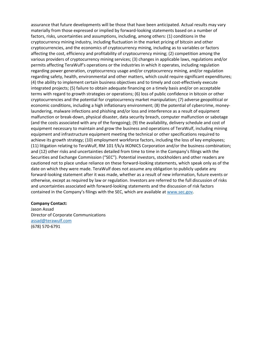 assurance that future developments will be those that have been anticipated. Actual results may vary materially from those expressed or implied by forward‐looking statements based on a number of factors, risks, uncertainties and assumptions, including, among others: (1) conditions in the cryptocurrency mining industry, including fluctuation in the market pricing of bitcoin and other cryptocurrencies, and the economics of cryptocurrency mining, including as to variables or factors affecting the cost, efficiency and profitability of cryptocurrency mining; (2) competition among the various providers of cryptocurrency mining services; (3) changes in applicable laws, regulations and/or permits affecting TeraWulf’s operations or the industries in which it operates, including regulation regarding power generation, cryptocurrency usage and/or cryptocurrency mining, and/or regulation regarding safety, health, environmental and other matters, which could require significant expenditures; (4) the ability to implement certain business objectives and to timely and cost‐effectively execute integrated projects; (5) failure to obtain adequate financing on a timely basis and/or on acceptable terms with regard to growth strategies or operations; (6) loss of public confidence in bitcoin or other cryptocurrencies and the potential for cryptocurrency market manipulation; (7) adverse geopolitical or economic conditions, including a high inflationary environment; (8) the potential of cybercrime, money‐ laundering, malware infections and phishing and/or loss and interference as a result of equipment malfunction or break‐down, physical disaster, data security breach, computer malfunction or sabotage (and the costs associated with any of the foregoing); (9) the availability, delivery schedule and cost of equipment necessary to maintain and grow the business and operations of TeraWulf, including mining equipment and infrastructure equipment meeting the technical or other specifications required to achieve its growth strategy; (10) employment workforce factors, including the loss of key employees; (11) litigation relating to TeraWulf, RM 101 f/k/a IKONICS Corporation and/or the business combination; and (12) other risks and uncertainties detailed from time to time in the Company’s filings with the Securities and Exchange Commission (“SEC”). Potential investors, stockholders and other readers are cautioned not to place undue reliance on these forward‐looking statements, which speak only as of the date on which they were made. TeraWulf does not assume any obligation to publicly update any forward‐looking statement after it was made, whether as a result of new information, future events or otherwise, except as required by law or regulation. Investors are referred to the full discussion of risks and uncertainties associated with forward‐looking statements and the discussion of risk factors contained in the Company’s filings with the SEC, which are available at www.sec.gov. Company Contact: Jason Assad Director of Corporate Communications assad@terawulf.com (678) 570‐6791