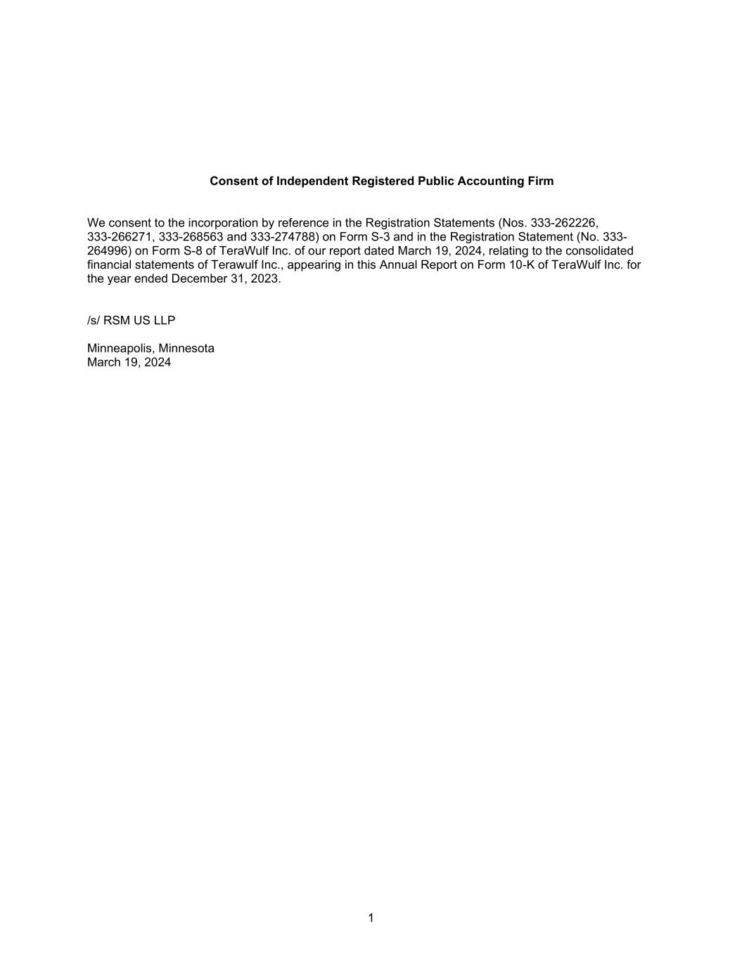 1 Consent of Independent Registered Public Accounting Firm We consent to the incorporation by reference in the Registration Statements (Nos. 333-262226, 333-266271, 333-268563 and 333-274788) on Form S-3 and in the Registration Statement (No. 333- 264996) on Form S-8 of TeraWulf Inc. of our report dated March 19, 2024, relating to the consolidated financial statements of Terawulf Inc., appearing in this Annual Report on Form 10-K of TeraWulf Inc. for the year ended December 31, 2023. /s/ RSM US LLP Minneapolis, Minnesota March 19, 2024