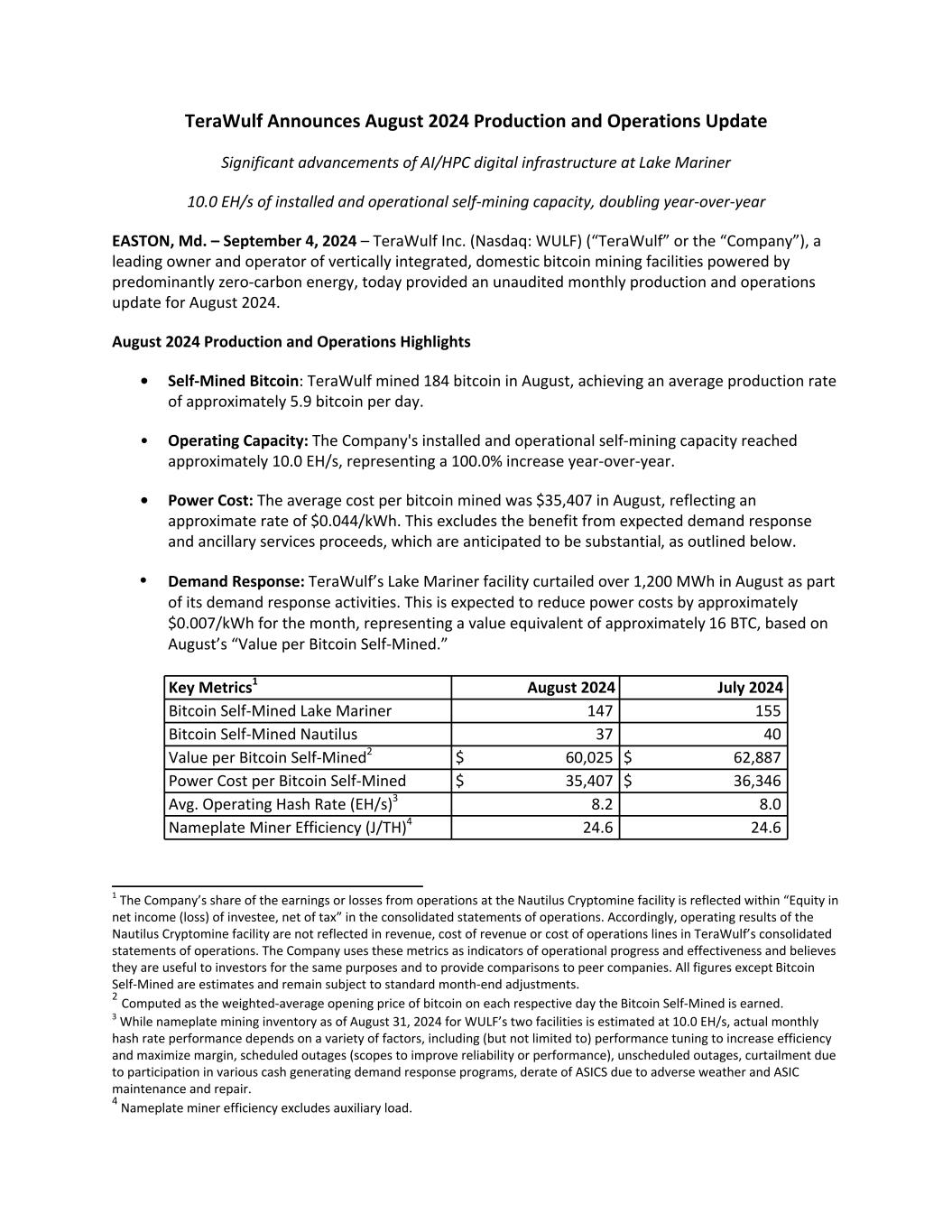 TeraWulf Announces August 2024 Production and Operations Update Significant advancements of AI/HPC digital infrastructure at Lake Mariner 10.0 EH/s of installed and operational self-mining capacity, doubling year-over-year EASTON, Md. – September 4, 2024 – TeraWulf Inc. (Nasdaq: WULF) (“TeraWulf” or the “Company”), a leading owner and operator of vertically integrated, domestic bitcoin mining facilities powered by predominantly zero-carbon energy, today provided an unaudited monthly production and operations update for August 2024. August 2024 Production and Operations Highlights • Self-Mined Bitcoin: TeraWulf mined 184 bitcoin in August, achieving an average production rate of approximately 5.9 bitcoin per day. • Operating Capacity: The Company's installed and operational self-mining capacity reached approximately 10.0 EH/s, representing a 100.0% increase year-over-year. • Power Cost: The average cost per bitcoin mined was $35,407 in August, reflecting an approximate rate of $0.044/kWh. This excludes the benefit from expected demand response and ancillary services proceeds, which are anticipated to be substantial, as outlined below. • Demand Response: TeraWulf’s Lake Mariner facility curtailed over 1,200 MWh in August as part of its demand response activities. This is expected to reduce power costs by approximately $0.007/kWh for the month, representing a value equivalent of approximately 16 BTC, based on August’s “Value per Bitcoin Self-Mined.” Key Metrics1 August 2024 July 2024 Bitcoin Self-Mined Lake Mariner 147 155 Bitcoin Self-Mined Nautilus 37 40 Value per Bitcoin Self-Mined2 $ 60,025 $ 62,887 Power Cost per Bitcoin Self-Mined $ 35,407 $ 36,346 Avg. Operating Hash Rate (EH/s)3 8.2 8.0 Nameplate Miner Efficiency (J/TH)4 24.6 24.6 1 The Company’s share of the earnings or losses from operations at the Nautilus Cryptomine facility is reflected within “Equity in net income (loss) of investee, net of tax” in the consolidated statements of operations. Accordingly, operating results of the Nautilus Cryptomine facility are not reflected in revenue, cost of revenue or cost of operations lines in TeraWulf’s consolidated statements of operations. The Company uses these metrics as indicators of operational progress and effectiveness and believes they are useful to investors for the same purposes and to provide comparisons to peer companies. All figures except Bitcoin Self-Mined are estimates and remain subject to standard month-end adjustments. 2 Computed as the weighted-average opening price of bitcoin on each respective day the Bitcoin Self-Mined is earned. 3 While nameplate mining inventory as of August 31, 2024 for WULF’s two facilities is estimated at 10.0 EH/s, actual monthly hash rate performance depends on a variety of factors, including (but not limited to) performance tuning to increase efficiency and maximize margin, scheduled outages (scopes to improve reliability or performance), unscheduled outages, curtailment due to participation in various cash generating demand response programs, derate of ASICS due to adverse weather and ASIC maintenance and repair. 4 Nameplate miner efficiency excludes auxiliary load.