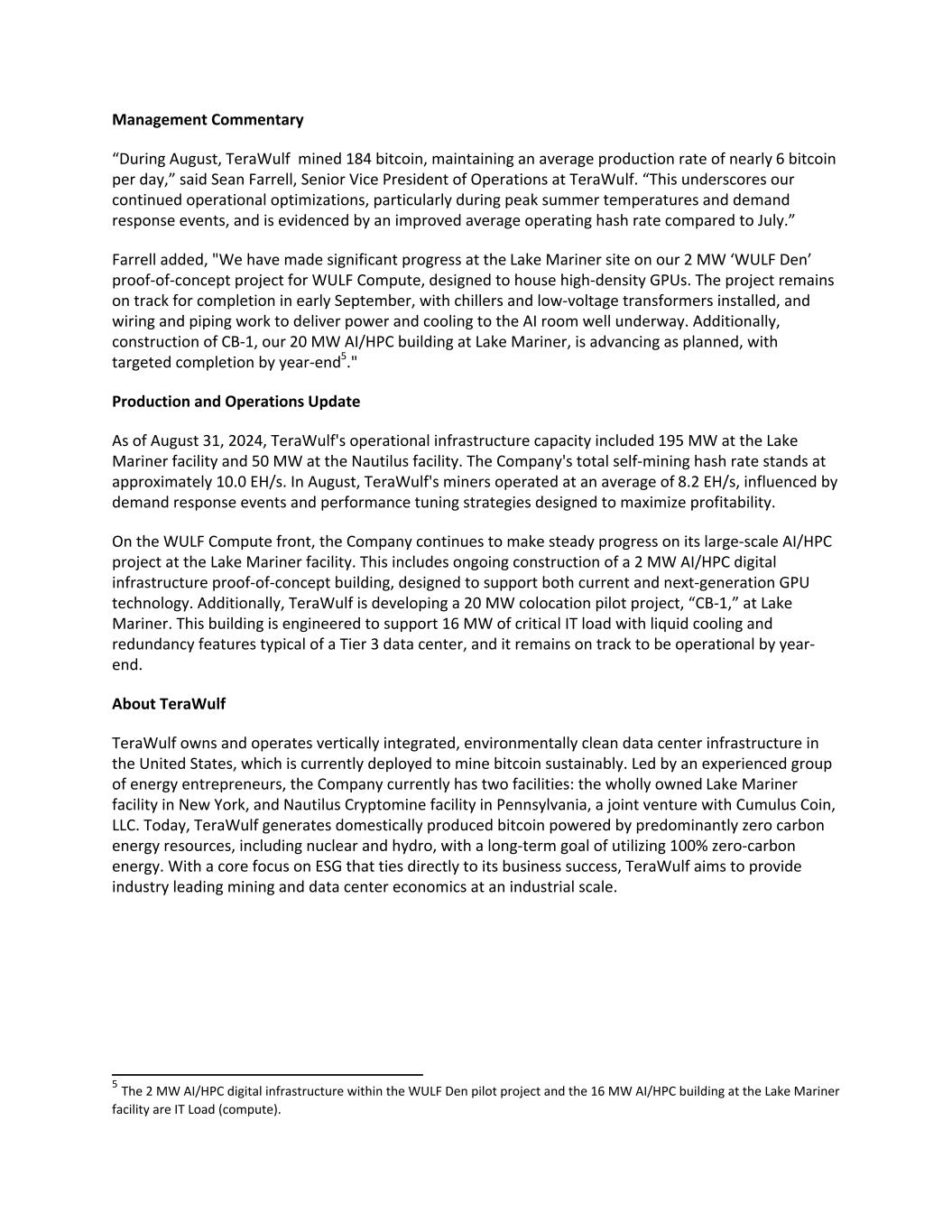 Management Commentary “During August, TeraWulf mined 184 bitcoin, maintaining an average production rate of nearly 6 bitcoin per day,” said Sean Farrell, Senior Vice President of Operations at TeraWulf. “This underscores our continued operational optimizations, particularly during peak summer temperatures and demand response events, and is evidenced by an improved average operating hash rate compared to July.” Farrell added, "We have made significant progress at the Lake Mariner site on our 2 MW ‘WULF Den’ proof-of-concept project for WULF Compute, designed to house high-density GPUs. The project remains on track for completion in early September, with chillers and low-voltage transformers installed, and wiring and piping work to deliver power and cooling to the AI room well underway. Additionally, construction of CB-1, our 20 MW AI/HPC building at Lake Mariner, is advancing as planned, with targeted completion by year-end5." Production and Operations Update As of August 31, 2024, TeraWulf's operational infrastructure capacity included 195 MW at the Lake Mariner facility and 50 MW at the Nautilus facility. The Company's total self-mining hash rate stands at approximately 10.0 EH/s. In August, TeraWulf's miners operated at an average of 8.2 EH/s, influenced by demand response events and performance tuning strategies designed to maximize profitability. On the WULF Compute front, the Company continues to make steady progress on its large-scale AI/HPC project at the Lake Mariner facility. This includes ongoing construction of a 2 MW AI/HPC digital infrastructure proof-of-concept building, designed to support both current and next-generation GPU technology. Additionally, TeraWulf is developing a 20 MW colocation pilot project, “CB-1,” at Lake Mariner. This building is engineered to support 16 MW of critical IT load with liquid cooling and redundancy features typical of a Tier 3 data center, and it remains on track to be operational by year- end. About TeraWulf TeraWulf owns and operates vertically integrated, environmentally clean data center infrastructure in the United States, which is currently deployed to mine bitcoin sustainably. Led by an experienced group of energy entrepreneurs, the Company currently has two facilities: the wholly owned Lake Mariner facility in New York, and Nautilus Cryptomine facility in Pennsylvania, a joint venture with Cumulus Coin, LLC. Today, TeraWulf generates domestically produced bitcoin powered by predominantly zero carbon energy resources, including nuclear and hydro, with a long-term goal of utilizing 100% zero-carbon energy. With a core focus on ESG that ties directly to its business success, TeraWulf aims to provide industry leading mining and data center economics at an industrial scale. 5 The 2 MW AI/HPC digital infrastructure within the WULF Den pilot project and the 16 MW AI/HPC building at the Lake Mariner facility are IT Load (compute).