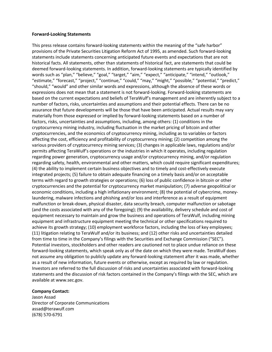 Forward-Looking Statements This press release contains forward-looking statements within the meaning of the “safe harbor” provisions of the Private Securities Litigation Reform Act of 1995, as amended. Such forward-looking statements include statements concerning anticipated future events and expectations that are not historical facts. All statements, other than statements of historical fact, are statements that could be deemed forward-looking statements. In addition, forward-looking statements are typically identified by words such as “plan,” “believe,” “goal,” “target,” “aim,” “expect,” “anticipate,” “intend,” “outlook,” “estimate,” “forecast,” “project,” “continue,” “could,” “may,” “might,” “possible,” “potential,” “predict,” “should,” “would” and other similar words and expressions, although the absence of these words or expressions does not mean that a statement is not forward-looking. Forward-looking statements are based on the current expectations and beliefs of TeraWulf’s management and are inherently subject to a number of factors, risks, uncertainties and assumptions and their potential effects. There can be no assurance that future developments will be those that have been anticipated. Actual results may vary materially from those expressed or implied by forward-looking statements based on a number of factors, risks, uncertainties and assumptions, including, among others: (1) conditions in the cryptocurrency mining industry, including fluctuation in the market pricing of bitcoin and other cryptocurrencies, and the economics of cryptocurrency mining, including as to variables or factors affecting the cost, efficiency and profitability of cryptocurrency mining; (2) competition among the various providers of cryptocurrency mining services; (3) changes in applicable laws, regulations and/or permits affecting TeraWulf’s operations or the industries in which it operates, including regulation regarding power generation, cryptocurrency usage and/or cryptocurrency mining, and/or regulation regarding safety, health, environmental and other matters, which could require significant expenditures; (4) the ability to implement certain business objectives and to timely and cost-effectively execute integrated projects; (5) failure to obtain adequate financing on a timely basis and/or on acceptable terms with regard to growth strategies or operations; (6) loss of public confidence in bitcoin or other cryptocurrencies and the potential for cryptocurrency market manipulation; (7) adverse geopolitical or economic conditions, including a high inflationary environment; (8) the potential of cybercrime, money- laundering, malware infections and phishing and/or loss and interference as a result of equipment malfunction or break-down, physical disaster, data security breach, computer malfunction or sabotage (and the costs associated with any of the foregoing); (9) the availability, delivery schedule and cost of equipment necessary to maintain and grow the business and operations of TeraWulf, including mining equipment and infrastructure equipment meeting the technical or other specifications required to achieve its growth strategy; (10) employment workforce factors, including the loss of key employees; (11) litigation relating to TeraWulf and/or its business; and (12) other risks and uncertainties detailed from time to time in the Company’s filings with the Securities and Exchange Commission (“SEC”). Potential investors, stockholders and other readers are cautioned not to place undue reliance on these forward-looking statements, which speak only as of the date on which they were made. TeraWulf does not assume any obligation to publicly update any forward-looking statement after it was made, whether as a result of new information, future events or otherwise, except as required by law or regulation. Investors are referred to the full discussion of risks and uncertainties associated with forward-looking statements and the discussion of risk factors contained in the Company’s filings with the SEC, which are available at www.sec.gov. Company Contact: Jason Assad Director of Corporate Communications assad@terawulf.com (678) 570-6791