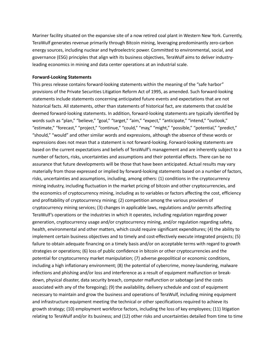 Mariner facility situated on the expansive site of a now retired coal plant in Western New York. Currently, TeraWulf generates revenue primarily through Bitcoin mining, leveraging predominantly zero-carbon energy sources, including nuclear and hydroelectric power. Committed to environmental, social, and governance (ESG) principles that align with its business objectives, TeraWulf aims to deliver industry- leading economics in mining and data center operations at an industrial scale. Forward-Looking Statements This press release contains forward-looking statements within the meaning of the “safe harbor” provisions of the Private Securities Litigation Reform Act of 1995, as amended. Such forward-looking statements include statements concerning anticipated future events and expectations that are not historical facts. All statements, other than statements of historical fact, are statements that could be deemed forward-looking statements. In addition, forward-looking statements are typically identified by words such as “plan,” “believe,” “goal,” “target,” “aim,” “expect,” “anticipate,” “intend,” “outlook,” “estimate,” “forecast,” “project,” “continue,” “could,” “may,” “might,” “possible,” “potential,” “predict,” “should,” “would” and other similar words and expressions, although the absence of these words or expressions does not mean that a statement is not forward-looking. Forward-looking statements are based on the current expectations and beliefs of TeraWulf’s management and are inherently subject to a number of factors, risks, uncertainties and assumptions and their potential effects. There can be no assurance that future developments will be those that have been anticipated. Actual results may vary materially from those expressed or implied by forward-looking statements based on a number of factors, risks, uncertainties and assumptions, including, among others: (1) conditions in the cryptocurrency mining industry, including fluctuation in the market pricing of bitcoin and other cryptocurrencies, and the economics of cryptocurrency mining, including as to variables or factors affecting the cost, efficiency and profitability of cryptocurrency mining; (2) competition among the various providers of cryptocurrency mining services; (3) changes in applicable laws, regulations and/or permits affecting TeraWulf’s operations or the industries in which it operates, including regulation regarding power generation, cryptocurrency usage and/or cryptocurrency mining, and/or regulation regarding safety, health, environmental and other matters, which could require significant expenditures; (4) the ability to implement certain business objectives and to timely and cost-effectively execute integrated projects; (5) failure to obtain adequate financing on a timely basis and/or on acceptable terms with regard to growth strategies or operations; (6) loss of public confidence in bitcoin or other cryptocurrencies and the potential for cryptocurrency market manipulation; (7) adverse geopolitical or economic conditions, including a high inflationary environment; (8) the potential of cybercrime, money-laundering, malware infections and phishing and/or loss and interference as a result of equipment malfunction or break- down, physical disaster, data security breach, computer malfunction or sabotage (and the costs associated with any of the foregoing); (9) the availability, delivery schedule and cost of equipment necessary to maintain and grow the business and operations of TeraWulf, including mining equipment and infrastructure equipment meeting the technical or other specifications required to achieve its growth strategy; (10) employment workforce factors, including the loss of key employees; (11) litigation relating to TeraWulf and/or its business; and (12) other risks and uncertainties detailed from time to time