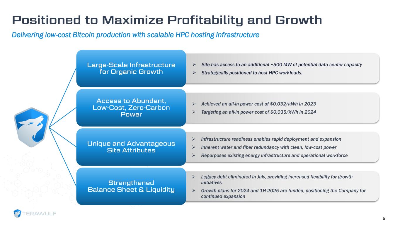 3 MW 60 MW 60 MW 110 MW 195 MW 245 MW 30 MW 50 MW 50 MW 0.3 EH/s 2.0 EH/s 3.3 EH/s 5.5 EH/s 10.0 EH/s 13.1 EH/s 0.0 EH/s 2.0 EH/s 4.0 EH/s 6.0 EH/s 8.0 EH/s 10.0 EH/s 12.0 EH/s 14.0 EH/s 0 MW 50 MW 100 MW 150 MW 200 MW 250 MW 300 MW 350 MW 400 MW 1H 2022 2H 2022 1H 2023 2H 2023 3Q 2024 1Q 2025E LMD Mining Nautilus Mining Total Hash Rate Our Operations ➢ Scalable Infrastructure: 750 MW of rapidly scalable capacity ➢ Sustainable Energy: located in region with 91% zero-carbon energy production. ➢ Low-Cost Bitcoin Production: industry- leading efficiency for profitable mining. ➢ Accelerating HPC Hosting: rapid growth in HPC hosting capabilities. Our Strategy ➢ 10 EH/s deployed in Q3 2024 ➢ 555 BTC mined in Q3 2024 981 BTC mined in Q3 2023 ➢ Realized $0.032/kWh power cost in 2023 ➢ Target $0.035/kWh power cost in 2024 ➢ Predominantly zero-carbon energy sources (1) Track Record of Execution Rapidly scaling since inception with significant owned capacity for growth 4 (2) (1) Source: “Power Trends 2024,” published by the New York Independent System Operator (NYISO). (2) Nautilus was sold on October 2, 2024. Sale proceeds comprised of $85 million cash consideration, the return of $1.3 million of working capital, and approximately $7 million worth of Talen contributed miners and related equipment.