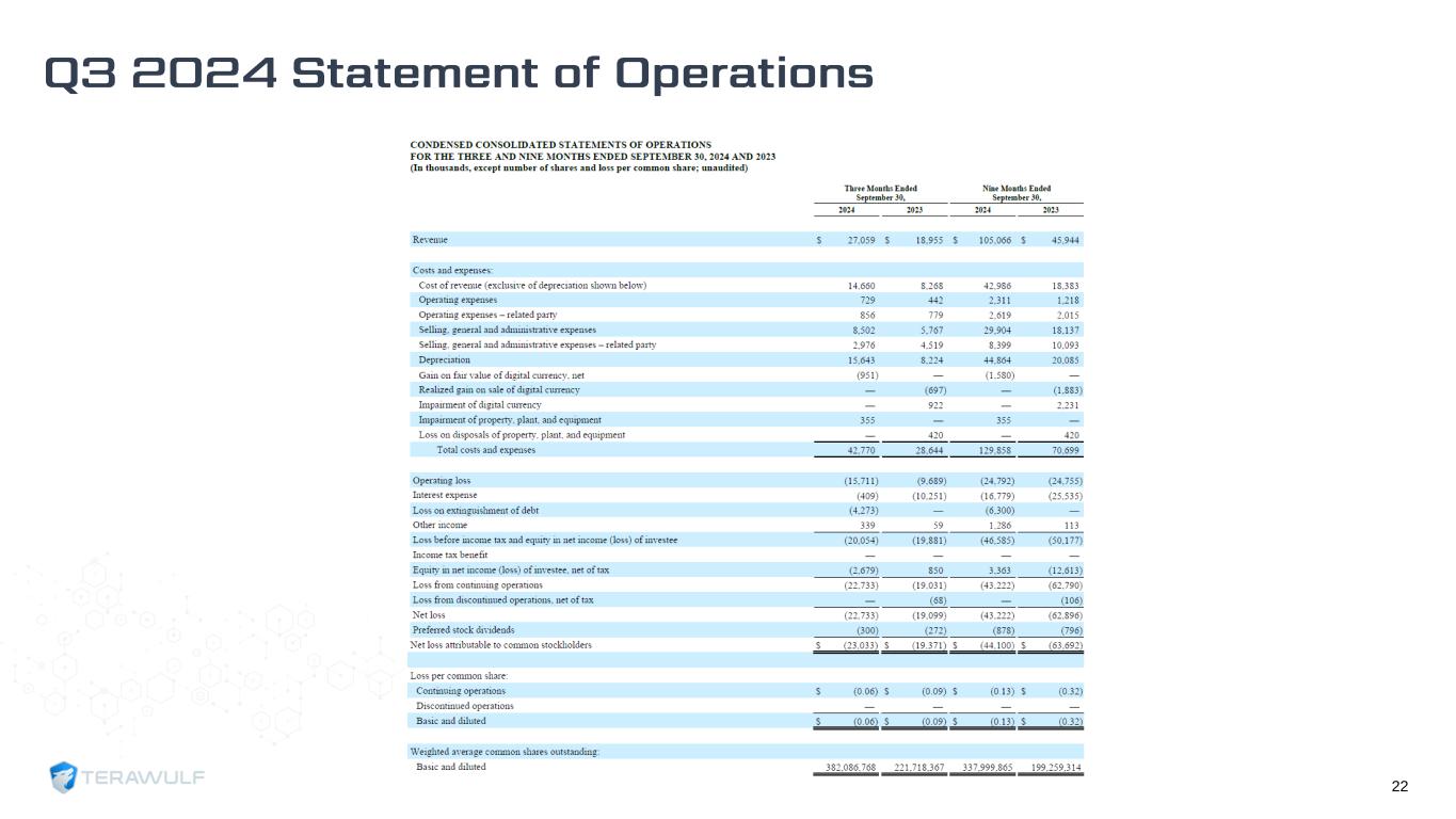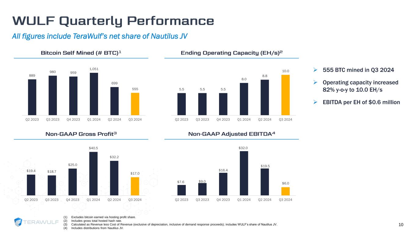All figures include TeraWulf’s net share of Nautilus JV 10 889 980 959 1,051 699 555 Q2 2023 Q3 2023 Q4 2023 Q1 2024 Q2 2024 Q3 2024 5.5 5.5 5.5 8.0 8.8 10.0 Q2 2023 Q3 2023 Q4 2023 Q1 2024 Q2 2024 Q3 2024 $19.4 $18.7 $25.0 $40.5 $32.2 $17.0 Q2 2023 Q3 2023 Q4 2023 Q1 2024 Q2 2024 Q3 2024 $7.6 $9.0 $16.4 $32.0 $19.5 $6.0 Q2 2023 Q3 2023 Q4 2023 Q1 2024 Q2 2024 Q3 2024 (1) Excludes bitcoin earned via hosting profit share. (2) Includes gross total hosted hash rate. (3) Calculated as Revenue less Cost of Revenue (exclusive of depreciation, inclusive of demand response proceeds); includes WULF’s share of Nautilus JV. (4) Includes distributions from Nautilus JV. ➢ 555 BTC mined in Q3 2024 ➢ Operating capacity increased 82% y-o-y to 10.0 EH/s ➢ EBITDA per EH of $0.6 million