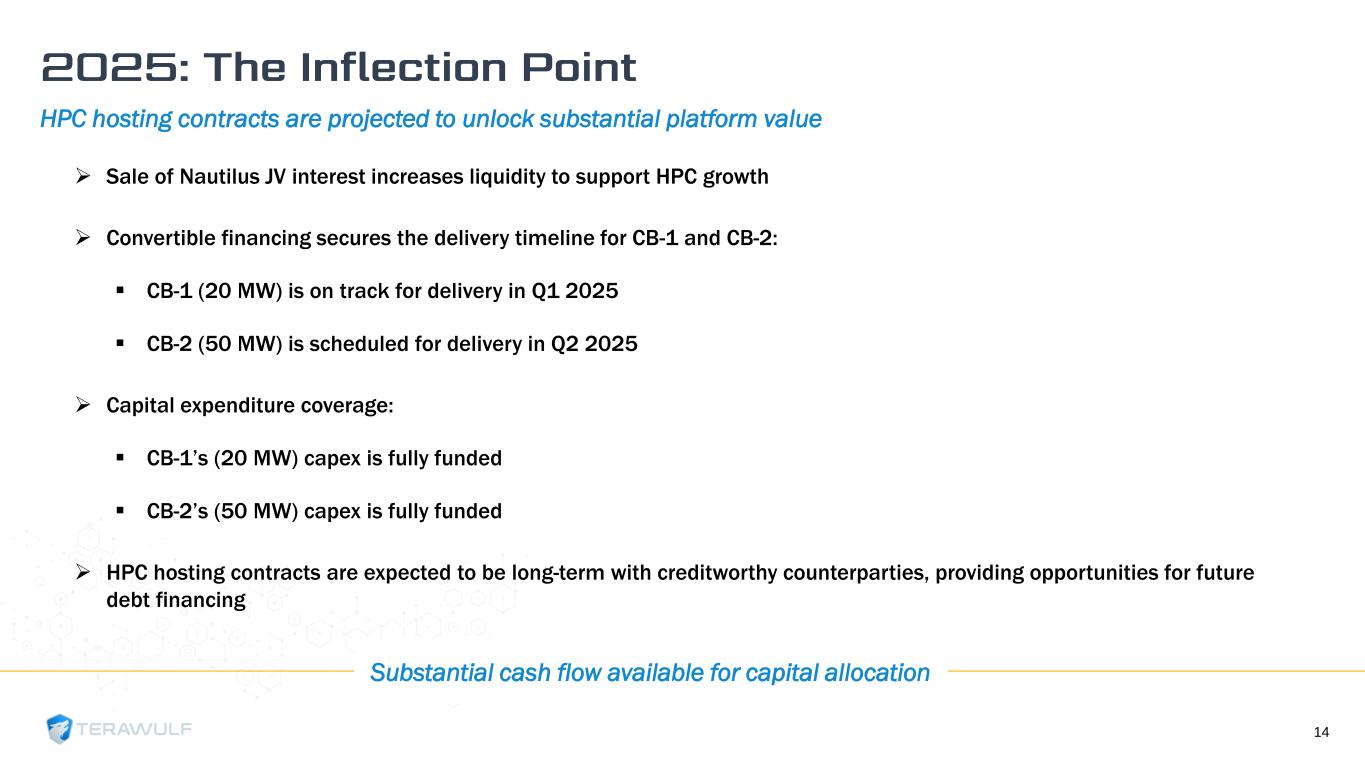 HPC hosting contracts are projected to unlock substantial platform value 13 (1) Estimated 2025E cash from operations assumes: 1) average BTC price of $80,000 and network hash rate of 725 EH/s; 2) 20 MW CB-1 and 50 MW CB-2 operating for 9 months and 6 months, respectively. (2) Estimated HPC Revenue Prepay assumes 1.25 average annual PUE and 12-month revenue prepay for 2.5 MW Wulf Den, 20 MW CB-1 and 50 MW CB-2 at $1.5M per MW. (3) Estimated Project Financing assumes that ~70% of total project costs for Wulf Den, CB-1 and CB-2 are financed. Substantial cash flow available for capital allocation $387.0