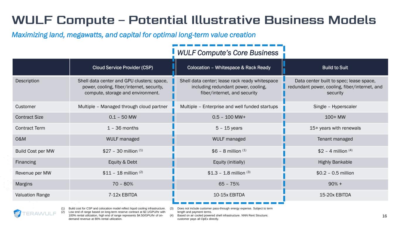 Maximizing land, megawatts, and capital for optimal long-term value creation 16 Cloud Service Provider (CSP) Colocation – Whitespace & Rack Ready Build to Suit Description Shell data center and GPU clusters; space, power, cooling, fiber/internet, security, compute, storage and environment. Shell data center; lease rack ready whitespace including redundant power, cooling, fiber/internet, and security Data center built to spec; lease space, redundant power, cooling, fiber/internet, and security Customer Multiple – Managed through cloud partner Multiple – Enterprise and well funded startups Single – Hyperscaler Contract Size 0.1 – 50 MW 0.5 – 100 MW+ 100+ MW Contract Term 1 – 36 months 5 – 15 years 15+ years with renewals O&M WULF managed WULF managed Tenant managed Build Cost per MW $27 – 30 million (1) $6 – 8 million (1) $2 – 4 million (4) Financing Equity & Debt Equity (initially) Highly Bankable Revenue per MW $11 – 18 million (2) $1.3 – 1.8 million (3) $0.2 – 0.5 million Margins 70 – 80% 65 – 75% 90% + Valuation Range 7-12x EBITDA 10-15x EBITDA 15-20x EBITDA (1) Build cost for CSP and colocation model reflect liquid cooling infrastructure. (2) Low end of range based on long-term reserve contract at $2.1/GPU/hr with 100% rental utilization, high end of range represents $4.50/GPU/hr of on- demand revenue at 80% rental utilization. (3) Does not include customer pass-through energy expense. Subject to term length and payment terms. (4) Based on air cooled powered shell infrastructure. NNN Rent Structure; customer pays all OpEx directly. WULF Compute’s Core Business