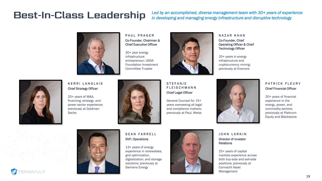 N A Z A R K H A N Co-Founder, Chief Operating Officer & Chief Technology Officer 20+ years in energy infrastructure and cryptocurrency mining; previously at Evercore P A U L P R A G E R Co-Founder, Chairman & Chief Executive Officer 30+ year energy infrastructure entrepreneur; USNA Foundation Investment Committee Trustee K E R R I L A N G L A I S Chief Strategy Officer 20+ years of M&A, financing, strategy, and power sector experience; previously at Goldman Sachs S T E F A N I E F L E I S C H M A N N Chief Legal Officer General Counsel for 15+ years overseeing all legal and compliance matters; previously at Paul, Weiss P A T R I C K F L E U R Y Chief Financial Officer 20+ years of financial experience in the energy, power, and commodity sectors; previously at Platinum Equity and Blackstone S E A N F A R R E L L SVP, Operations 13+ years of energy experience in renewables, grid optimization, digitalization, and storage solutions; previously at Siemens Energy J O H N L A R K I N Director of Investor Relations 25+ years of capital markets experience across both buy-side and sell-side positions; previously at Connacht Asset Management Led by an accomplished, diverse management team with 30+ years of experience in developing and managing energy infrastructure and disruptive technology 19
