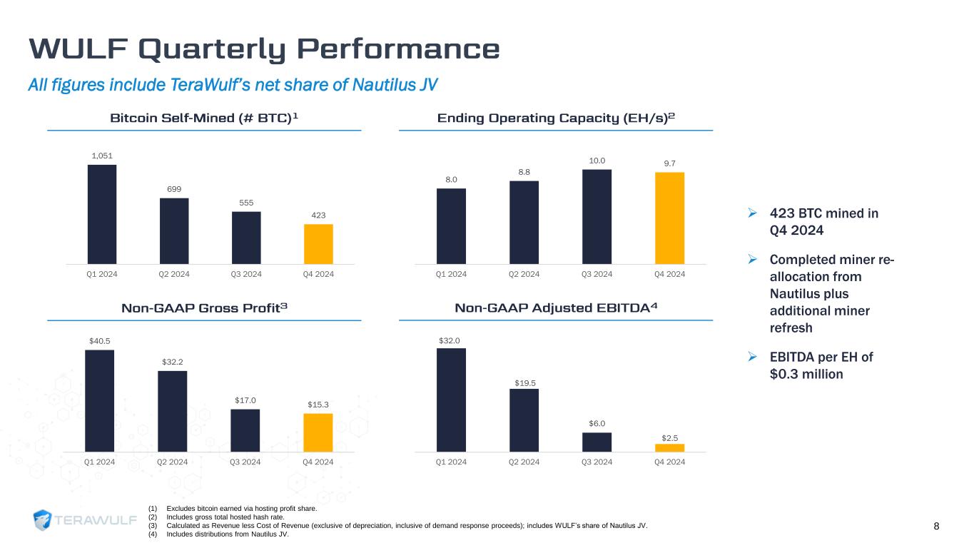 Positive EBITDA despite a difficult operating environment 7 Metric Amount Comments End of Period Hash Rate 9.7 EH/s ➢ 94% increase year-over-year in self-mining hash rate Bitcoin Self-Mined 423 ➢ 4.6 BTC per day Power Cost $0.059/kWh ➢ Represents power cost per BTC of $46,328 Revenue (1) $34.9 million ➢ 102% increase year-over-year; value per BTC self-mined (Non-GAAP) averaged ~$83k(2)(3) Non-GAAP Adjusted EBITDA (2) $2.5 million ➢ EBITDA/EH of $0.3 million Cash and Cash Equivalents $274.1 million ➢ Excludes BTC of $0.5 million (4) Net Debt (5) $225.9 million ➢ Term loan debt fully repaid July 2024; $500 million 2.75% convertible notes issued in October 2024 (1) GAAP measure; excludes Nautilus JV. (2) Computed as the weighted average opening price of BTC on each respective day the self-mined BTC is earned. (3) Non-GAAP measure; includes Nautilus JV. (4) Based on the closing market price per one Bitcoin of $93,354 on December 31, 2024. (5) Net Debt as of December 31, 2024, reflects $500 million 2.75% convertible notes due 2030 and $274.1 million of cash.