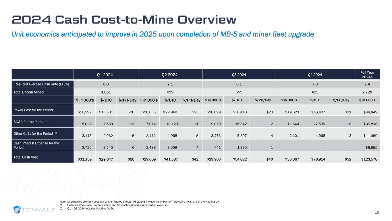 All figures include TeraWulf’s net share of Nautilus JV 8 1,051 699 555 423 Q1 2024 Q2 2024 Q3 2024 Q4 2024 8.0 8.8 10.0 9.7 Q1 2024 Q2 2024 Q3 2024 Q4 2024 $40.5 $32.2 $17.0 $15.3 Q1 2024 Q2 2024 Q3 2024 Q4 2024 $32.0 $19.5 $6.0 $2.5 Q1 2024 Q2 2024 Q3 2024 Q4 2024 (1) Excludes bitcoin earned via hosting profit share. (2) Includes gross total hosted hash rate. (3) Calculated as Revenue less Cost of Revenue (exclusive of depreciation, inclusive of demand response proceeds); includes WULF’s share of Nautilus JV. (4) Includes distributions from Nautilus JV. ➢ 423 BTC mined in Q4 2024 ➢ Completed miner re- allocation from Nautilus plus additional miner refresh ➢ EBITDA per EH of $0.3 million