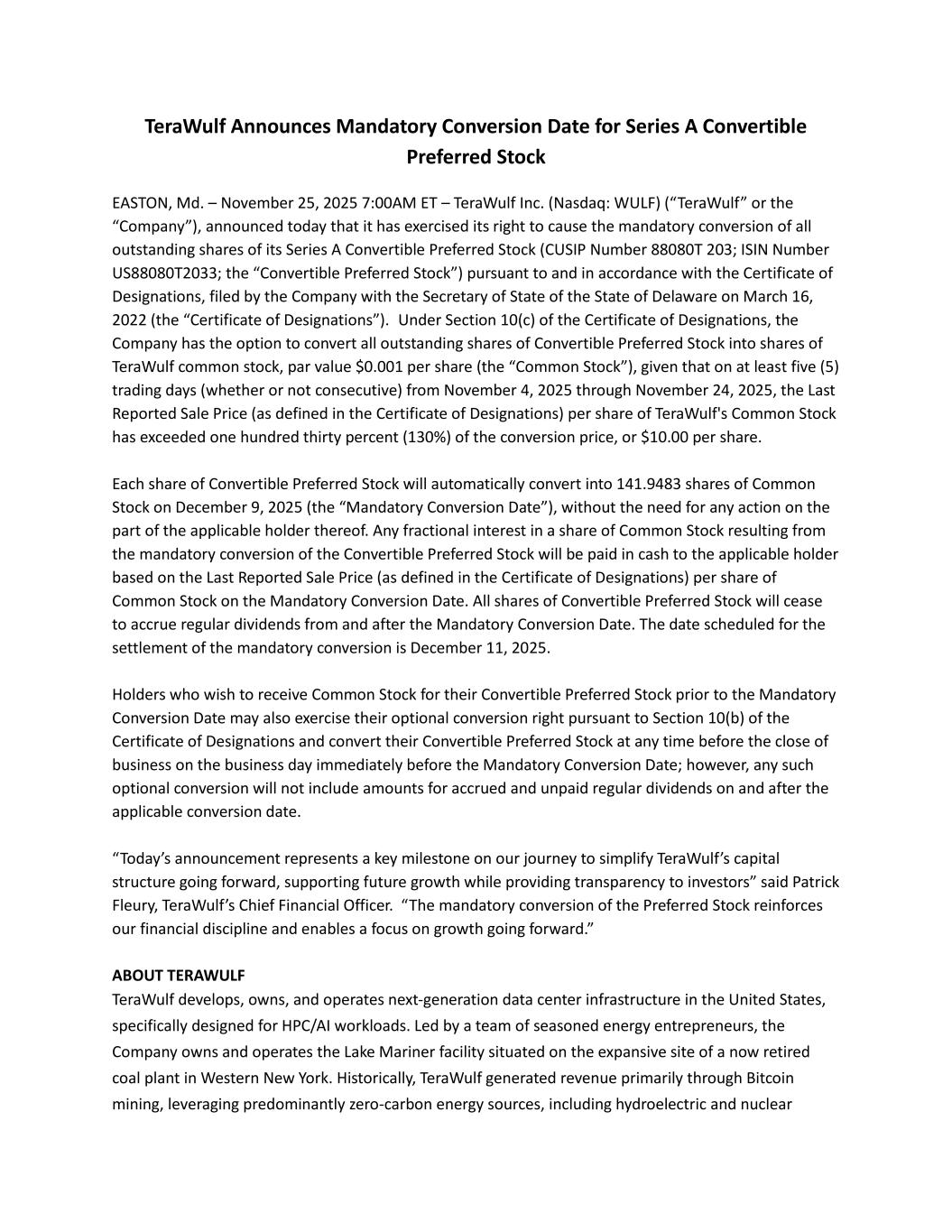TeraWulf Announces Mandatory Conversion Date for Series A Convertible Preferred Stock EASTON, Md. – November 25, 2025 7:00AM ET – TeraWulf Inc. (Nasdaq: WULF) (“TeraWulf” or the “Company”), announced today that it has exercised its right to cause the mandatory conversion of all outstanding shares of its Series A Convertible Preferred Stock (CUSIP Number 88080T 203; ISIN Number US88080T2033; the “Convertible Preferred Stock”) pursuant to and in accordance with the Certificate of Designations, filed by the Company with the Secretary of State of the State of Delaware on March 16, 2022 (the “Certificate of Designations”). Under Section 10(c) of the Certificate of Designations, the Company has the option to convert all outstanding shares of Convertible Preferred Stock into shares of TeraWulf common stock, par value $0.001 per share (the “Common Stock”), given that on at least five (5) trading days (whether or not consecutive) from November 4, 2025 through November 24, 2025, the Last Reported Sale Price (as defined in the Certificate of Designations) per share of TeraWulf's Common Stock has exceeded one hundred thirty percent (130%) of the conversion price, or $10.00 per share. Each share of Convertible Preferred Stock will automatically convert into 141.9483 shares of Common Stock on December 9, 2025 (the “Mandatory Conversion Date”), without the need for any action on the part of the applicable holder thereof. Any fractional interest in a share of Common Stock resulting from the mandatory conversion of the Convertible Preferred Stock will be paid in cash to the applicable holder based on the Last Reported Sale Price (as defined in the Certificate of Designations) per share of Common Stock on the Mandatory Conversion Date. All shares of Convertible Preferred Stock will cease to accrue regular dividends from and after the Mandatory Conversion Date. The date scheduled for the settlement of the mandatory conversion is December 11, 2025. Holders who wish to receive Common Stock for their Convertible Preferred Stock prior to the Mandatory Conversion Date may also exercise their optional conversion right pursuant to Section 10(b) of the Certificate of Designations and convert their Convertible Preferred Stock at any time before the close of business on the business day immediately before the Mandatory Conversion Date; however, any such optional conversion will not include amounts for accrued and unpaid regular dividends on and after the applicable conversion date. “Today’s announcement represents a key milestone on our journey to simplify TeraWulf’s capital structure going forward, supporting future growth while providing transparency to investors” said Patrick Fleury, TeraWulf’s Chief Financial Officer. “The mandatory conversion of the Preferred Stock reinforces our financial discipline and enables a focus on growth going forward.” ABOUT TERAWULF TeraWulf develops, owns, and operates next-generation data center infrastructure in the United States, specifically designed for HPC/AI workloads. Led by a team of seasoned energy entrepreneurs, the Company owns and operates the Lake Mariner facility situated on the expansive site of a now retired coal plant in Western New York. Historically, TeraWulf generated revenue primarily through Bitcoin mining, leveraging predominantly zero-carbon energy sources, including hydroelectric and nuclear