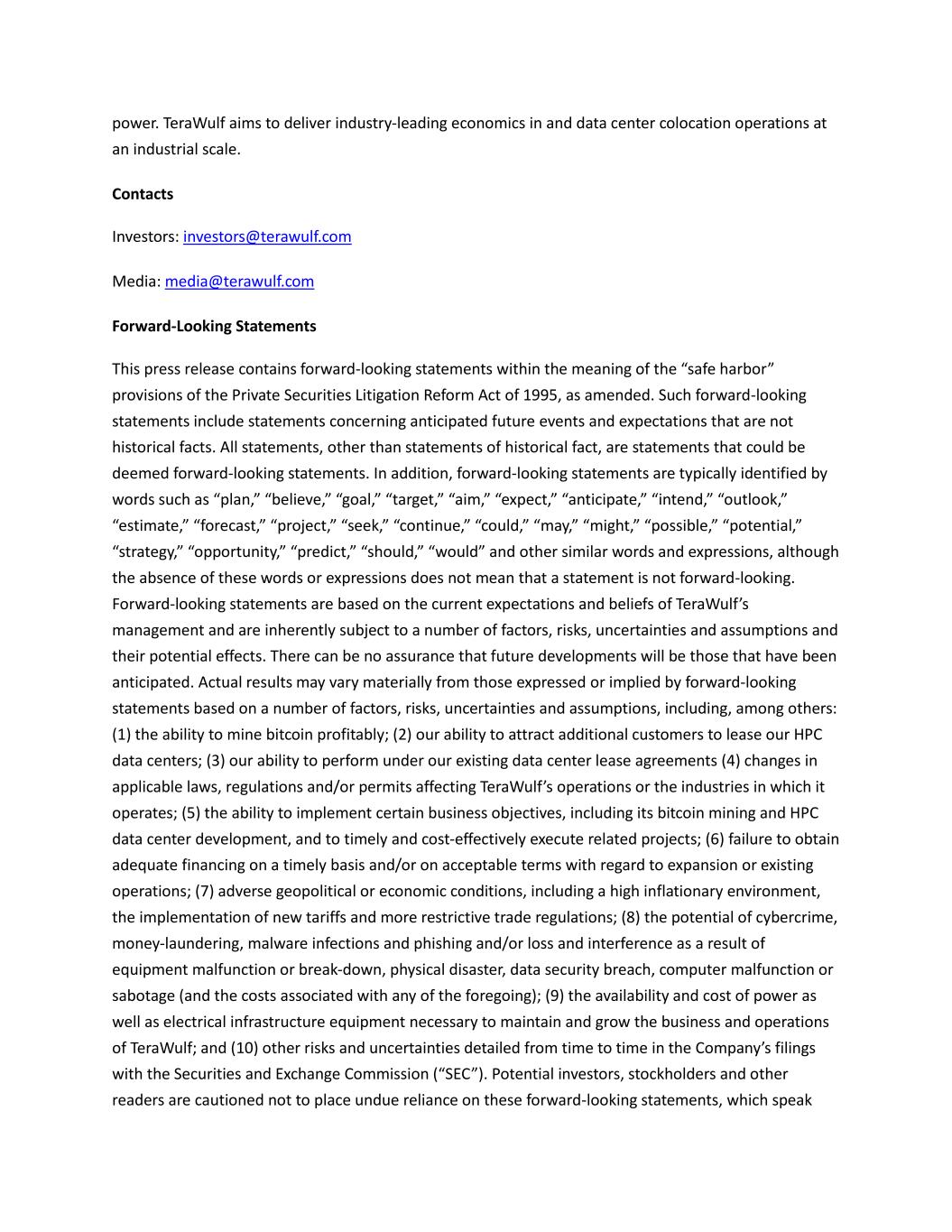 power. TeraWulf aims to deliver industry-leading economics in and data center colocation operations at an industrial scale. Contacts Investors: investors@terawulf.com Media: media@terawulf.com Forward-Looking Statements This press release contains forward-looking statements within the meaning of the “safe harbor” provisions of the Private Securities Litigation Reform Act of 1995, as amended. Such forward-looking statements include statements concerning anticipated future events and expectations that are not historical facts. All statements, other than statements of historical fact, are statements that could be deemed forward-looking statements. In addition, forward-looking statements are typically identified by words such as “plan,” “believe,” “goal,” “target,” “aim,” “expect,” “anticipate,” “intend,” “outlook,” “estimate,” “forecast,” “project,” “seek,” “continue,” “could,” “may,” “might,” “possible,” “potential,” “strategy,” “opportunity,” “predict,” “should,” “would” and other similar words and expressions, although the absence of these words or expressions does not mean that a statement is not forward-looking. Forward-looking statements are based on the current expectations and beliefs of TeraWulf’s management and are inherently subject to a number of factors, risks, uncertainties and assumptions and their potential effects. There can be no assurance that future developments will be those that have been anticipated. Actual results may vary materially from those expressed or implied by forward-looking statements based on a number of factors, risks, uncertainties and assumptions, including, among others: (1) the ability to mine bitcoin profitably; (2) our ability to attract additional customers to lease our HPC data centers; (3) our ability to perform under our existing data center lease agreements (4) changes in applicable laws, regulations and/or permits affecting TeraWulf’s operations or the industries in which it operates; (5) the ability to implement certain business objectives, including its bitcoin mining and HPC data center development, and to timely and cost-effectively execute related projects; (6) failure to obtain adequate financing on a timely basis and/or on acceptable terms with regard to expansion or existing operations; (7) adverse geopolitical or economic conditions, including a high inflationary environment, the implementation of new tariffs and more restrictive trade regulations; (8) the potential of cybercrime, money-laundering, malware infections and phishing and/or loss and interference as a result of equipment malfunction or break-down, physical disaster, data security breach, computer malfunction or sabotage (and the costs associated with any of the foregoing); (9) the availability and cost of power as well as electrical infrastructure equipment necessary to maintain and grow the business and operations of TeraWulf; and (10) other risks and uncertainties detailed from time to time in the Company’s filings with the Securities and Exchange Commission (“SEC”). Potential investors, stockholders and other readers are cautioned not to place undue reliance on these forward-looking statements, which speak