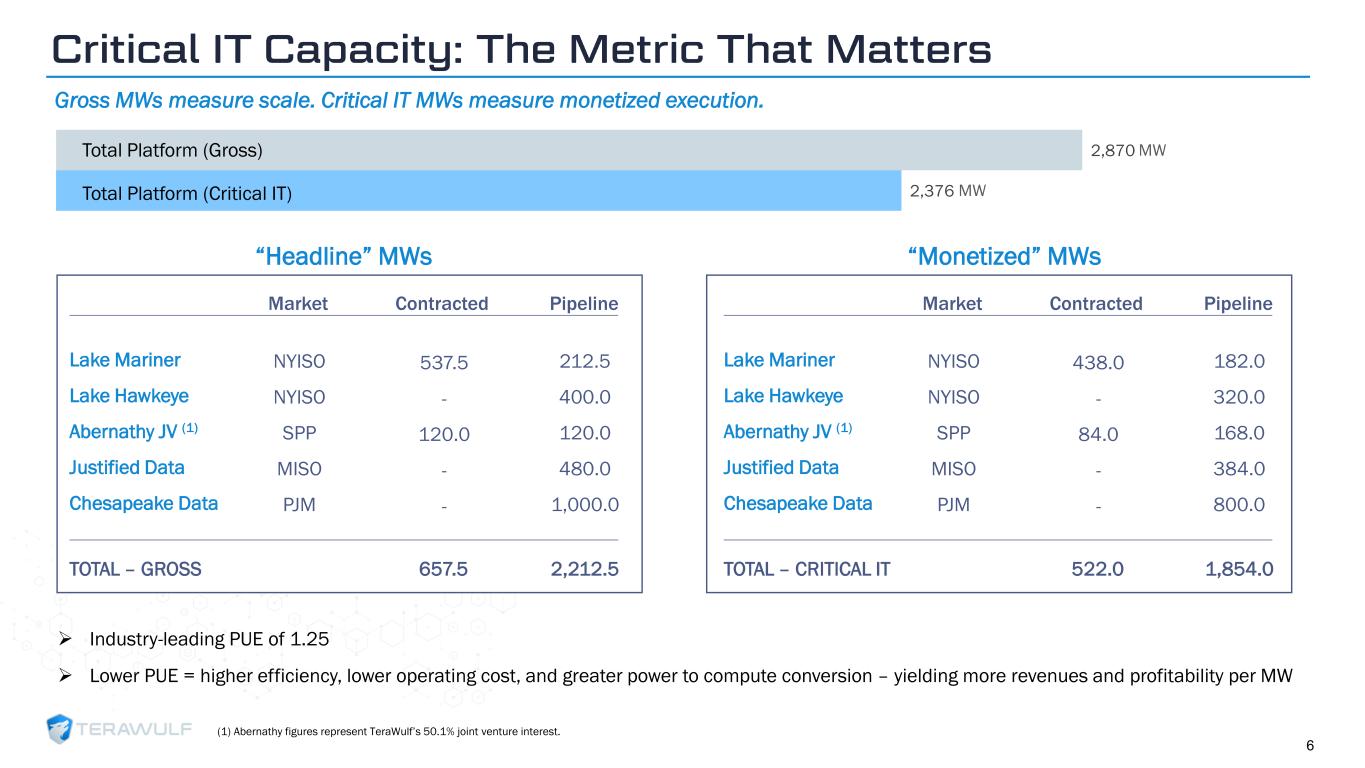 Geom Slide Title – 28 Franklin Gothic Med Header – 14 Franklin Gothic Book Content Text – 14 Franklin Gothic Book Chart Content – 10 RGB 33 – 40 – 64 20 – 135 – 211 129 – 200 – 255 205 – 217 – 225 74 – 88 – 135 Outline: black, ½ pt. 255 – 177 – 0 Contracted Platform Snapshot ➢ Three long-term data center leases across two campuses Stable | Credit-Enhanced | Long-Duration ➢ Investment grade credit enhancement ➢ Stable, contracted NOI 522 MW 10 -25Y ~$815M CRITICAL IT LEASED BASE LEASE TERMS AVG. ANNUALIZED NOI ~$13B CONTRACTED REVENUE 5 (1) Includes TeraWulf’s 50.1% interest in Abernathy’s net operating income. Abernathy is not consolidated in TeraWulf’s financial statements; the investment is accounted for under the equity method, with TeraWulf’s proportionate share reflected as “equity in net income of investee, net of tax” in the consolidated statement of operations. (1)