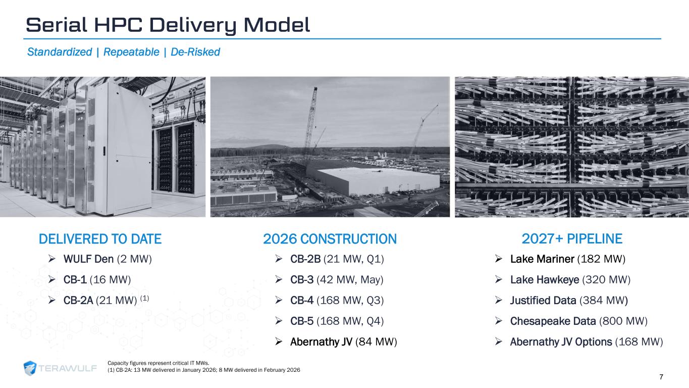 Geom Slide Title – 28 Franklin Gothic Med Header – 14 Franklin Gothic Book Content Text – 14 Franklin Gothic Book Chart Content – 10 RGB 33 – 40 – 64 20 – 135 – 211 129 – 200 – 255 205 – 217 – 225 74 – 88 – 135 Outline: black, ½ pt. 255 – 177 – 0 $1,479 (100) (225) $1,154 $268 $1,087 $1,300 Lake Mariner Lake Hawkeye Abernathy JV (1) Justified Data Chesapeake Data Critical IT Capacity: The Metric That Matters Gross MWs measure scale. Critical IT MWs measure monetized execution. Market Contracted Pipeline NYISO NYISO SPP MISO PJM 537.5 - 120.0 - - 212.5 400.0 120.0 480.0 1,000.0 TOTAL – GROSS 657.5 2,212.5 $1,479 (100) (225) $1,154 $268 $1,087 $1,300 Lake Mariner Lake Hawkeye Abernathy JV (1) Justified Data Chesapeake Data Market Contracted Pipeline NYISO NYISO SPP MISO PJM 438.0 - 84.0 - - 182.0 320.0 168.0 384.0 800.0 TOTAL – CRITICAL IT 522.0 1,854.0 2,376 2,870 MW MW Total Platform (Gross) Total Platform (Critical IT) 6 ➢ Industry-leading PUE of 1.25 ➢ Lower PUE = higher efficiency, lower operating cost, and greater power to compute conversion – yielding more revenues and profitability per MW “Headline” MWs “Monetized” MWs (1) Abernathy figures represent TeraWulf’s 50.1% joint venture interest.