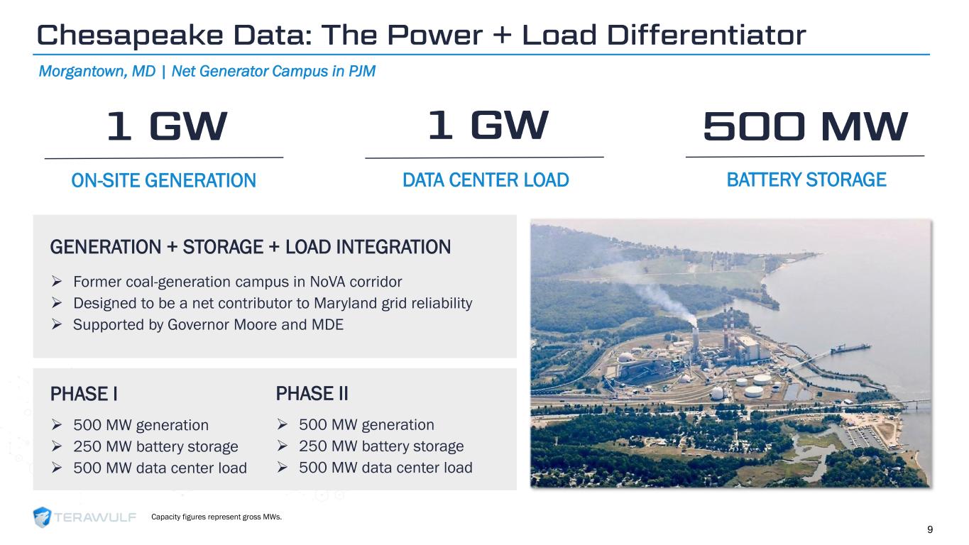 Geom Slide Title – 28 Franklin Gothic Med Header – 14 Franklin Gothic Book Content Text – 14 Franklin Gothic Book Chart Content – 10 RGB 33 – 40 – 64 20 – 135 – 211 129 – 200 – 255 205 – 217 – 225 74 – 88 – 135 Outline: black, ½ pt. 255 – 177 – 0 ➢ Strong state and community support ➢ Recognized economic anchor project for the State 8 Justified Data: The Immediate Power Campus Hawesville, KY | 480 MW Campus in MISO 480 MW IMMEDIATE POWER ACTIVE HYPERSCALER DEMAND LOCAL ALIGNMENT EXPANSION OPTIONALITY ➢ Additional scalable capacity ➢ Grid-powered or on-site gen ➢ Active engagement with major hyperscalers ➢ Data room open; diligence process underway ➢ Targeting 2H 2027 delivery CUSTOMER DEMAND Capacity figures represent gross MWs.