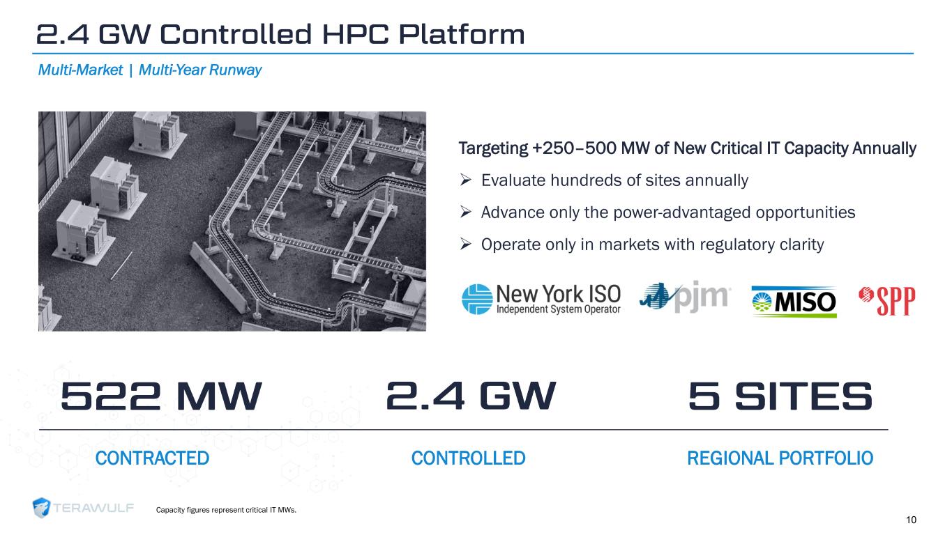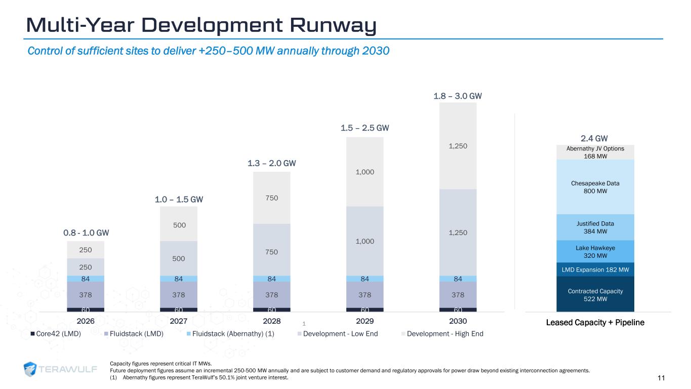 Geom Slide Title – 28 Franklin Gothic Med Header – 14 Franklin Gothic Book Content Text – 14 Franklin Gothic Book Chart Content – 10 RGB 33 – 40 – 64 20 – 135 – 211 129 – 200 – 255 205 – 217 – 225 74 – 88 – 135 Outline: black, ½ pt. 255 – 177 – 0 Capacity figures represent critical IT MWs. Future deployment figures assume an incremental 250-500 MW annually and are subject to customer demand and regulatory approvals for power draw beyond existing interconnection agreements. (1) Abernathy figures represent TeraWulf’s 50.1% joint venture interest. 1 11 60 60 60 60 60 378 378 378 378 378 84 84 84 84 84 250 500 750 1,000 1,250 250 500 750 1,000 1,250 2026 2027 2028 2029 2030 Core42 (LMD) Fluidstack (LMD) Fluidstack (Abernathy) (1) Development - Low End Development - High End 1.0 – 1.5 GW 1.3 – 2.0 GW 1.5 – 2.5 GW 0.8 - 1.0 GW 1.8 – 3.0 GW Leased Capacity + Pipeline Contracted Capacity 522 MW LMD Expansion 182 MW Lake Hawkeye 320 MW Justified Data 384 MW Chesapeake Data 800 MW Abernathy JV Options 168 MW 2.4 GW Multi -Year Development Runway Control of sufficient sites to deliver +250–500 MW annually through 2030