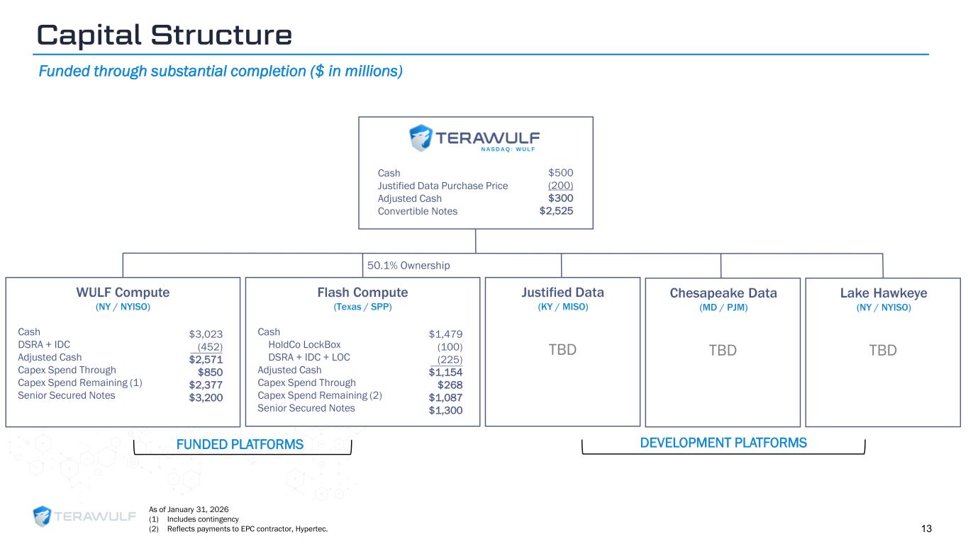 Geom Slide Title – 28 Franklin Gothic Med Header – 14 Franklin Gothic Book Content Text – 14 Franklin Gothic Book Chart Content – 10 RGB 33 – 40 – 64 20 – 135 – 211 129 – 200 – 255 205 – 217 – 225 74 – 88 – 135 Outline: black, ½ pt. 255 – 177 – 0 Capital Structure Funded through substantial completion ($ in millions) As of January 31, 2026 (1) Includes contingency (2) Reflects payments to EPC contractor, Hypertec. 50.1% Ownership Cash Justified Data Purchase Price Adjusted Cash Convertible Notes $500 (200) $300 $2,525 Cash DSRA + IDC Adjusted Cash Capex Spend Through Capex Spend Remaining (1) Senior Secured Notes WULF Compute (NY / NYISO) $3,023 (452) $2,571 $850 $2,377 $3,200 $1,479 (100) (225) $1,154 $268 $1,087 $1,300 Cash HoldCo LockBox DSRA + IDC + LOC Adjusted Cash Capex Spend Through Capex Spend Remaining (2) Senior Secured Notes Flash Compute (Texas / SPP) $1,479 (100) (225) $1,154 $268 $1,087 $1,300 $1,479 (100) (225) TBD $268 $1,087 $1,300 Justified Data (KY / MISO) $1,479 (100) (225 TBD $268 $1,087 $1,300 Chesapeake Data (MD / PJM) $1,479 (100) (225) TBD $268 $1,087 $1,300 Lake Hawkeye (NY / NYISO) 13 FUNDED PLATFORMS DEVELOPMENT PLATFORMS
