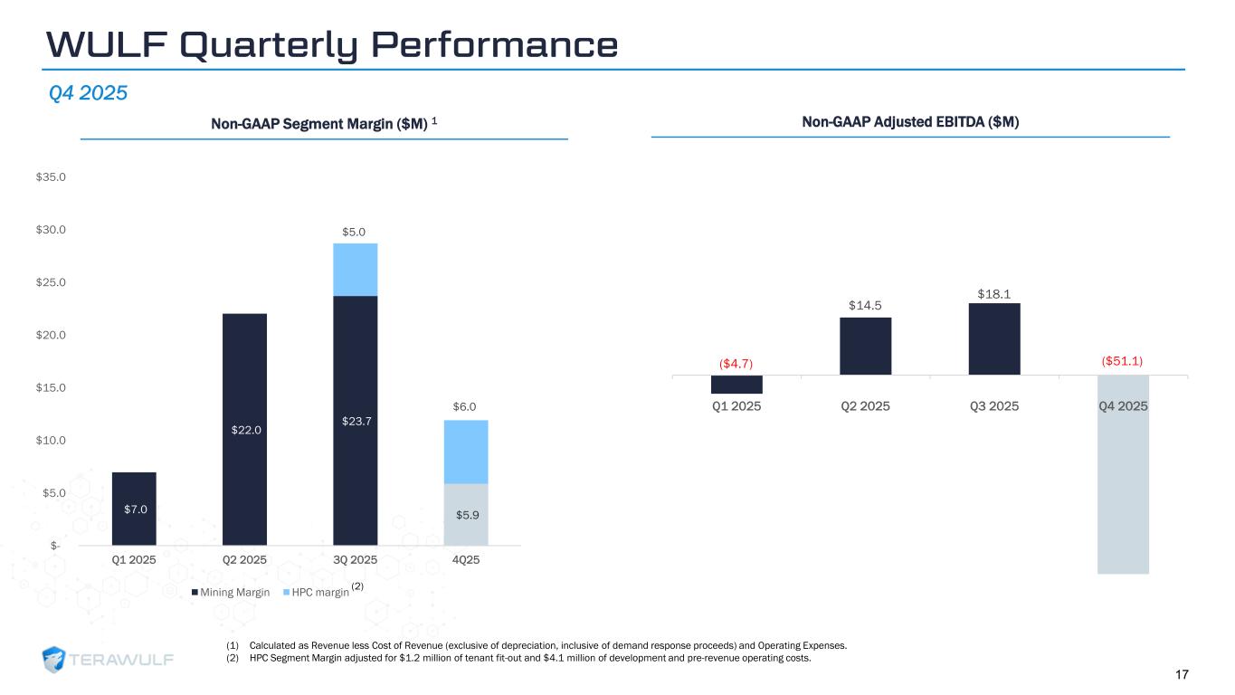 Geom Slide Title – 28 Franklin Gothic Med Header – 14 Franklin Gothic Book Content Text – 14 Franklin Gothic Book Chart Content – 10 RGB 33 – 40 – 64 20 – 135 – 211 129 – 200 – 255 205 – 217 – 225 74 – 88 – 135 Outline: black, ½ pt. 255 – 177 – 0 $7.0 $22.0 $23.7 $5.9 $5.0 $6.0 $- $5.0 $10.0 $15.0 $20.0 $25.0 $30.0 $35.0 Q1 2025 Q2 2025 3Q 2025 4Q25 Mining Margin HPC margin Q4 2025 Non-GAAP Segment Margin ($M) 1 ($4.7) $14.5 $18.1 ($51.1) Q1 2025 Q2 2025 Q3 2025 Q4 2025 Non-GAAP Adjusted EBITDA ($M) (1) Calculated as Revenue less Cost of Revenue (exclusive of depreciation, inclusive of demand response proceeds) and Operating Expenses. (2) HPC Segment Margin adjusted for $1.2 million of tenant fit-out and $4.1 million of development and pre-revenue operating costs. 17 (2) WULF Quarterly Performance