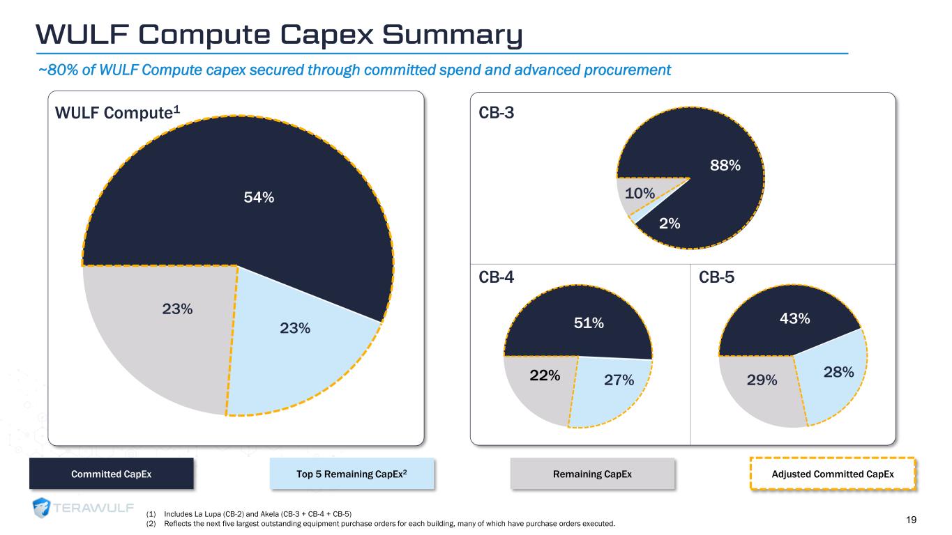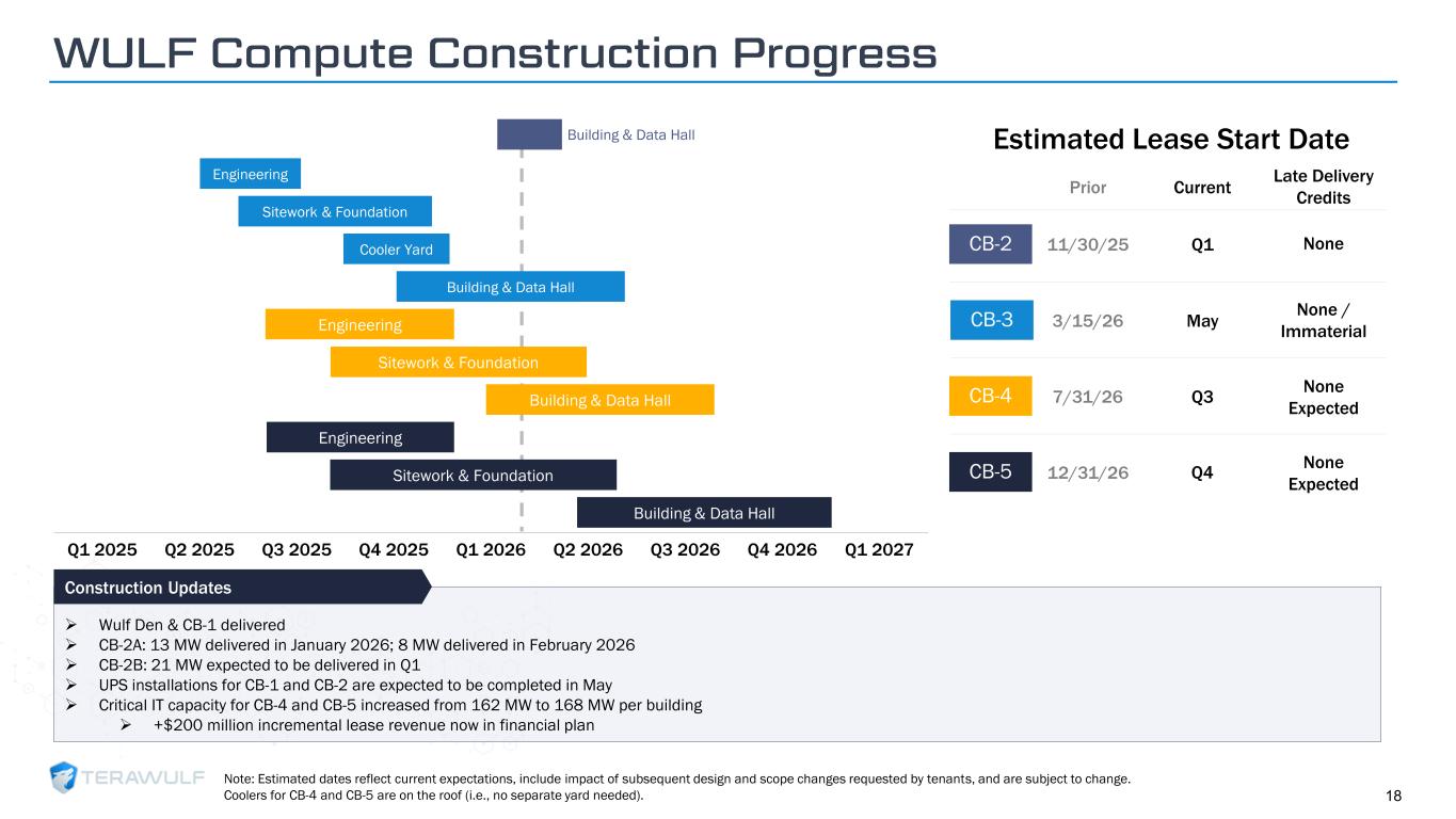 Geom Slide Title – 28 Franklin Gothic Med Header – 14 Franklin Gothic Book Content Text – 14 Franklin Gothic Book Chart Content – 10 RGB 33 – 40 – 64 20 – 135 – 211 129 – 200 – 255 205 – 217 – 225 74 – 88 – 135 Outline: black, ½ pt. 255 – 177 – 0 WULF Compute Construction Progress Building & Data Hall Engineering Sitework & Foundation Cooler Yard Q1 2025 Q2 2025 Q3 2025 Q4 2025 Q1 2026 Q2 2026 Q3 2026 Q4 2026 Q1 2027 Engineering Sitework & Foundation Building & Data Hall Engineering Sitework & Foundation Building & Data Hall Building & Data Hall Note: Estimated dates reflect current expectations, include impact of subsequent design and scope changes requested by tenants, and are subject to change. Coolers for CB-4 and CB-5 are on the roof (i.e., no separate yard needed). ➢ Wulf Den & CB-1 delivered ➢ CB-2A: 13 MW delivered in January 2026; 8 MW delivered in February 2026 ➢ CB-2B: 21 MW expected to be delivered in Q1 ➢ UPS installations for CB-1 and CB-2 are expected to be completed in May ➢ Critical IT capacity for CB-4 and CB-5 increased from 162 MW to 168 MW per building ➢ +$200 million incremental lease revenue now in financial plan Construction Updates CB-2 CB-3 CB-5 Estimated Lease Start Date CB-4 Q1 May Q3 Q4 Prior Current 3/15/26 7/31/26 12/31/26 11/30/25 None None / Immaterial None Expected None Expected Late Delivery Credits 18