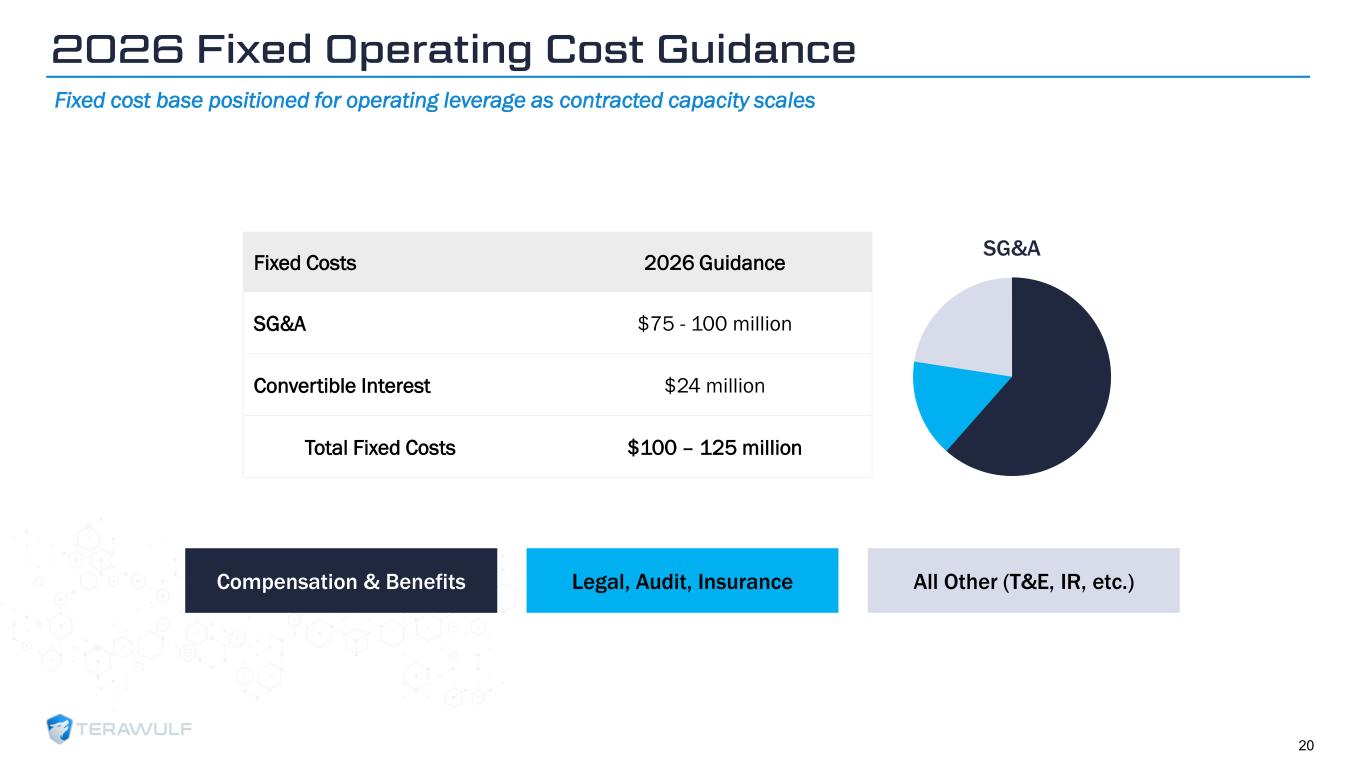 Geom Slide Title – 28 Franklin Gothic Med Header – 14 Franklin Gothic Book Content Text – 14 Franklin Gothic Book Chart Content – 10 RGB 33 – 40 – 64 20 – 135 – 211 129 – 200 – 255 205 – 217 – 225 74 – 88 – 135 Outline: black, ½ pt. 255 – 177 – 0 85% Committed CapEx Top 5 Remaining CapEx2 Remaining CapEx Adjusted Committed CapEx WULF Compute1 CB-3 CB-4 CB-5 43% 28% 29% 51% 22% 27% 54% 23% 23% 88% 10% 2% (1) Includes La Lupa (CB-2) and Akela (CB-3 + CB-4 + CB-5) (2) Reflects the next five largest outstanding equipment purchase orders for each building, many of which have purchase orders executed. 19 WULF Compute Capex Summary ~80% of WULF Compute capex secured through committed spend and advanced procurement