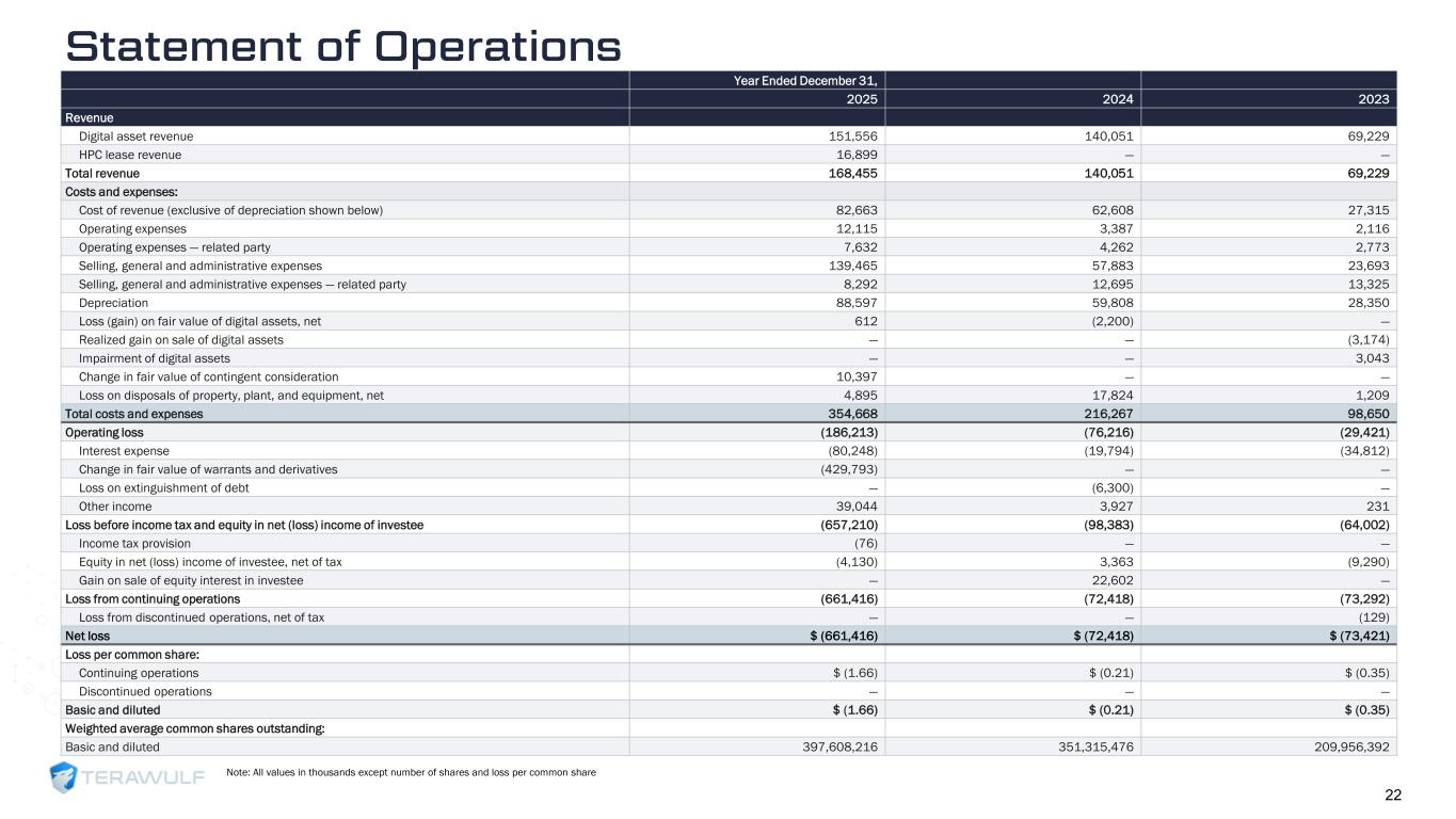 Geom Slide Title – 28 Franklin Gothic Med Header – 14 Franklin Gothic Book Content Text – 14 Franklin Gothic Book Chart Content – 10 RGB 33 – 40 – 64 20 – 135 – 211 129 – 200 – 255 205 – 217 – 225 74 – 88 – 135 Outline: black, ½ pt. 255 – 177 – 0 Statement of Operations Note: All values in thousands except number of shares and loss per common share 22 Year Ended December 31, 2025 2024 2023 Revenue Digital asset revenue 151,556 140,051 69,229 HPC lease revenue 16,899 — — Total revenue 168,455 140,051 69,229 Costs and expenses: Cost of revenue (exclusive of depreciation shown below) 82,663 62,608 27,315 Operating expenses 12,115 3,387 2,116 Operating expenses — related party 7,632 4,262 2,773 Selling, general and administrative expenses 139,465 57,883 23,693 Selling, general and administrative expenses — related party 8,292 12,695 13,325 Depreciation 88,597 59,808 28,350 Loss (gain) on fair value of digital assets, net 612 (2,200) — Realized gain on sale of digital assets — — (3,174) Impairment of digital assets — — 3,043 Change in fair value of contingent consideration 10,397 — — Loss on disposals of property, plant, and equipment, net 4,895 17,824 1,209 Total costs and expenses 354,668 216,267 98,650 Operating loss (186,213) (76,216) (29,421) Interest expense (80,248) (19,794) (34,812) Change in fair value of warrants and derivatives (429,793) — — Loss on extinguishment of debt — (6,300) — Other income 39,044 3,927 231 Loss before income tax and equity in net (loss) income of investee (657,210) (98,383) (64,002) Income tax provision (76) — — Equity in net (loss) income of investee, net of tax (4,130) 3,363 (9,290) Gain on sale of equity interest in investee — 22,602 — Loss from continuing operations (661,416) (72,418) (73,292) Loss from discontinued operations, net of tax — — (129) Net loss $ (661,416) $ (72,418) $ (73,421) Loss per common share: Continuing operations $ (1.66) $ (0.21) $ (0.35) Discontinued operations — — — Basic and diluted $ (1.66) $ (0.21) $ (0.35) Weighted average common shares outstanding: Basic and diluted 397,608,216 351,315,476 209,956,392