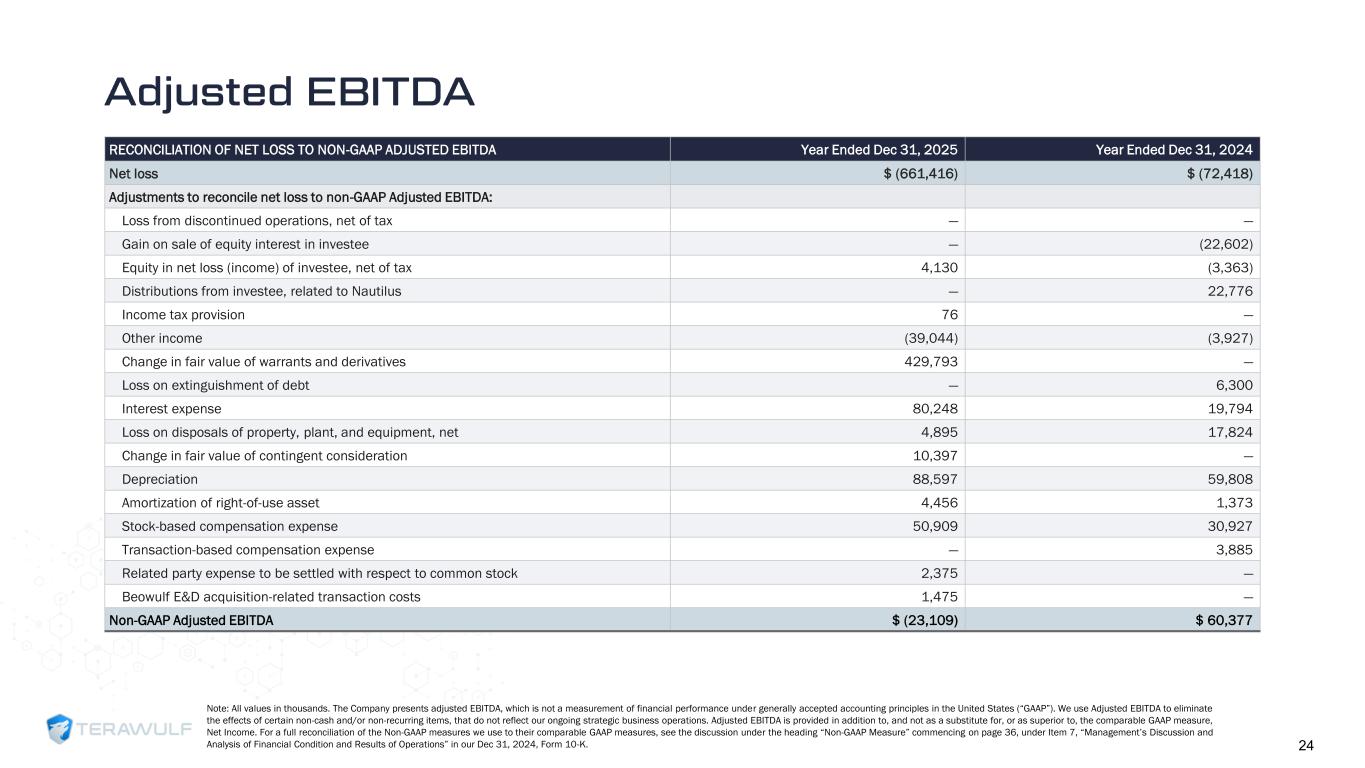 Geom Slide Title – 28 Franklin Gothic Med Header – 14 Franklin Gothic Book Content Text – 14 Franklin Gothic Book Chart Content – 10 RGB 33 – 40 – 64 20 – 135 – 211 129 – 200 – 255 205 – 217 – 225 74 – 88 – 135 Outline: black, ½ pt. 255 – 177 – 0 Adjusted EBITDA Note: All values in thousands. The Company presents adjusted EBITDA, which is not a measurement of financial performance under generally accepted accounting principles in the United States (“GAAP”). We use Adjusted EBITDA to eliminate the effects of certain non-cash and/or non-recurring items, that do not reflect our ongoing strategic business operations. Adjusted EBITDA is provided in addition to, and not as a substitute for, or as superior to, the comparable GAAP measure, Net Income. For a full reconciliation of the Non-GAAP measures we use to their comparable GAAP measures, see the discussion under the heading “Non-GAAP Measure” commencing on page 36, under Item 7, “Management’s Discussion and Analysis of Financial Condition and Results of Operations” in our Dec 31, 2024, Form 10-K. 24 RECONCILIATION OF NET LOSS TO NON-GAAP ADJUSTED EBITDA Year Ended Dec 31, 2025 Year Ended Dec 31, 2024 Net loss $ (661,416) $ (72,418) Adjustments to reconcile net loss to non-GAAP Adjusted EBITDA: Loss from discontinued operations, net of tax — — Gain on sale of equity interest in investee — (22,602) Equity in net loss (income) of investee, net of tax 4,130 (3,363) Distributions from investee, related to Nautilus — 22,776 Income tax provision 76 — Other income (39,044) (3,927) Change in fair value of warrants and derivatives 429,793 — Loss on extinguishment of debt — 6,300 Interest expense 80,248 19,794 Loss on disposals of property, plant, and equipment, net 4,895 17,824 Change in fair value of contingent consideration 10,397 — Depreciation 88,597 59,808 Amortization of right-of-use asset 4,456 1,373 Stock-based compensation expense 50,909 30,927 Transaction-based compensation expense — 3,885 Related party expense to be settled with respect to common stock 2,375 — Beowulf E&D acquisition-related transaction costs 1,475 — Non-GAAP Adjusted EBITDA $ (23,109) $ 60,377
