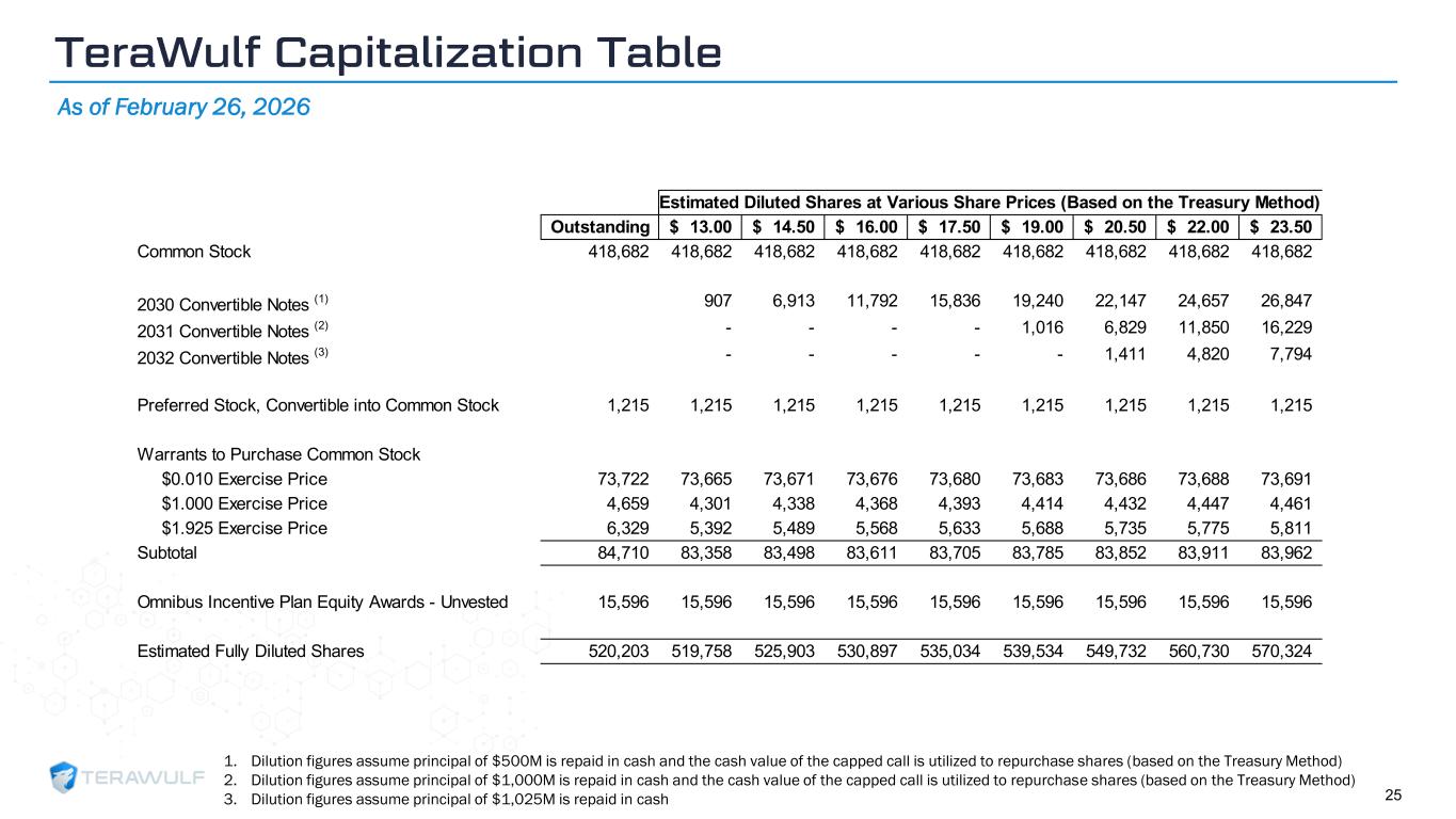 Geom Slide Title – 28 Franklin Gothic Med Header – 14 Franklin Gothic Book Content Text – 14 Franklin Gothic Book Chart Content – 10 RGB 33 – 40 – 64 20 – 135 – 211 129 – 200 – 255 205 – 217 – 225 74 – 88 – 135 Outline: black, ½ pt. 255 – 177 – 0 1. Dilution figures assume principal of $500M is repaid in cash and the cash value of the capped call is utilized to repurchase shares (based on the Treasury Method) 2. Dilution figures assume principal of $1,000M is repaid in cash and the cash value of the capped call is utilized to repurchase shares (based on the Treasury Method) 3. Dilution figures assume principal of $1,025M is repaid in cash 25 Outstanding 13.00$ 14.50$ 16.00$ 17.50$ 19.00$ 20.50$ 22.00$ 23.50$ Common Stock 418,682 418,682 418,682 418,682 418,682 418,682 418,682 418,682 418,682 2030 Convertible Notes (1) 907 6,913 11,792 15,836 19,240 22,147 24,657 26,847 2031 Convertible Notes (2) - - - - 1,016 6,829 11,850 16,229 2032 Convertible Notes (3) - - - - - 1,411 4,820 7,794 Preferred Stock, Convertible into Common Stock 1,215 1,215 1,215 1,215 1,215 1,215 1,215 1,215 1,215 Warrants to Purchase Common Stock $0.010 Exercise Price 73,722 73,665 73,671 73,676 73,680 73,683 73,686 73,688 73,691 $1.000 Exercise Price 4,659 4,301 4,338 4,368 4,393 4,414 4,432 4,447 4,461 $1.925 Exercise Price 6,329 5,392 5,489 5,568 5,633 5,688 5,735 5,775 5,811 Subtotal 84,710 83,358 83,498 83,611 83,705 83,785 83,852 83,911 83,962 Omnibus Incentive Plan Equity Awards - Unvested 15,596 15,596 15,596 15,596 15,596 15,596 15,596 15,596 15,596 Estimated Fully Diluted Shares 520,203 519,758 525,903 530,897 535,034 539,534 549,732 560,730 570,324 Estimated Diluted Shares at Various Share Prices (Based on the Treasury Method) TeraWulf Capitalization Table As of February 26, 2026