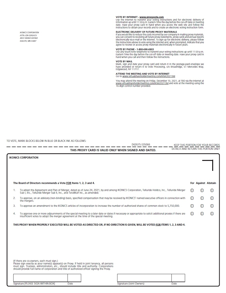 Signature [PLEASE SIGN WITHIN BOX] Date Signature (Joint Owners) Date TO VOTE, MARK BLOCKS BELOW IN BLUE OR BLACK INK AS FOLLOWS: KEEP THIS PORTION FOR YOUR RECORDS THIS PROXY CARD IS VALID ONLY WHEN SIGNED AND DATED. DETACH AND RETURN THIS PORTION ONLY D62675-S35066 For Against Abstain ! ! ! ! ! ! IKONICS CORPORATION ATTN: JON GERLACH 4832 GRAND AVENUE DULUTH, MN 55807 2. To approve, on an advisory (non-binding) basis, specified compensation that may be received by IKONICS’ named executive officers in connection with the mergers. 3. To approve an amendment to the IKONICS articles of incorporation to increase the number of authorized shares of common stock to 5,750,000. 4. To approve one or more adjournments of the special meeting to a later date or dates if necessary or appropriate to solicit additional proxies if there are insufficient votes to adopt the merger agreement at the time of the special meeting. THIS PROXY WHEN PROPERLY EXECUTED WILL BE VOTED AS DIRECTED OR, IF NO DIRECTION IS GIVEN, WILL BE VOTED FOR ITEMS 1, 2, 3 AND 4. (If there are co-owners, each must sign.) Please sign exactly as your name(s) appear(s) on Proxy. If held in joint tenancy, all persons must sign. Trustees, administrators, etc., should include title and authority. Corporations should provide full name of corporation and title of authorized officer signing the Proxy. 1. To adopt the Agreement and Plan of Merger, dated as of June 24, 2021, by and among IKONICS Corporation, Telluride Holdco, Inc., Telluride Merger Sub I, Inc., Telluride Merger Sub II, Inc., and TeraWulf Inc., as amended. The Board of Directors recommends a Vote FOR Items 1, 2, 3 and 4. IKONICS CORPORATION ! ! ! ! ! ! VOTE BY INTERNET - www.proxyvote.com Use the Internet to transmit your voting instructions and for electronic delivery of information up until 11:59 p.m. Eastern Time the day before the cut-off date or meeting date. Have your proxy card in hand when you access the web site and follow the instructions to obtain your records and to create an electronic voting instruction form. ELECTRONIC DELIVERY OF FUTURE PROXY MATERIALS If you would like to reduce the costs incurred by our company in mailing proxy materials, you can consent to receiving all future proxy statements, proxy cards and annual reports electronically via e-mail or the Internet. To sign up for electronic delivery, please follow the instructions above to vote using the Internet and, when prompted, indicate that you agree to receive or access proxy materials electronically in future years. VOTE BY PHONE - 1-800-690-6903 Use any touch-tone telephone to transmit your voting instructions up until 11:59 p.m. Eastern Time the day before the cut-off date or meeting date. Have your proxy card in hand when you call and then follow the instructions. VOTE BY MAIL Mark, sign and date your proxy card and return it in the postage-paid envelope we have provided or return it to Vote Processing, c/o Broadridge, 51 Mercedes Way, Edgewood, NY 11717. ATTEND THE MEETING AND VOTE BY INTERNET Go to www.virtualshareholdermeeting.com/IKNX2021SM You may attend the meeting on Friday, December 10, 2021, at TBD via the Internet at www.virtualshareholdermeeting.com/IKNX2021SM and vote at the meeting using the 16-digit control number provided. D62676-S35066 Important Notice Regarding the Availability of Proxy Materials for the Special Meeting: The Proxy Statement and Annual Report are available at www.proxyvote.com.