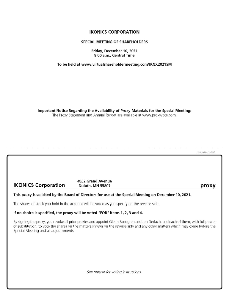IKONICS CORPORATION SPECIAL MEETING OF SHAREHOLDERS Friday, December 10, 2021 TBD To be held at www.virtualshareholdermeeting.com/IKNX2021SM This proxy is solicited by the Board of Directors for use at the Special Meeting on December 10, 2021. The shares of stock you hold in the account will be voted as you specify on the reverse side. If no choice is specified, the proxy will be voted "FOR" Items 1, 2, 3 and 4. By signing the proxy, you revoke all prior proxies and appoint Glenn Sandgren and Jon Gerlach, and each of them, with full power of substitution, to vote the shares on the matters shown on the reverse side and any other matters which may come before the Special Meeting and all adjournments. See reverse for voting instructions. IKONICS Corporation 4832 Grand Avenue Duluth, MN 55807 proxy