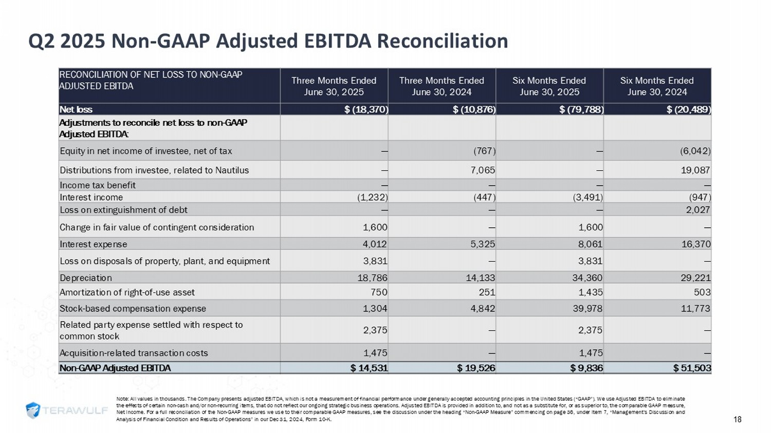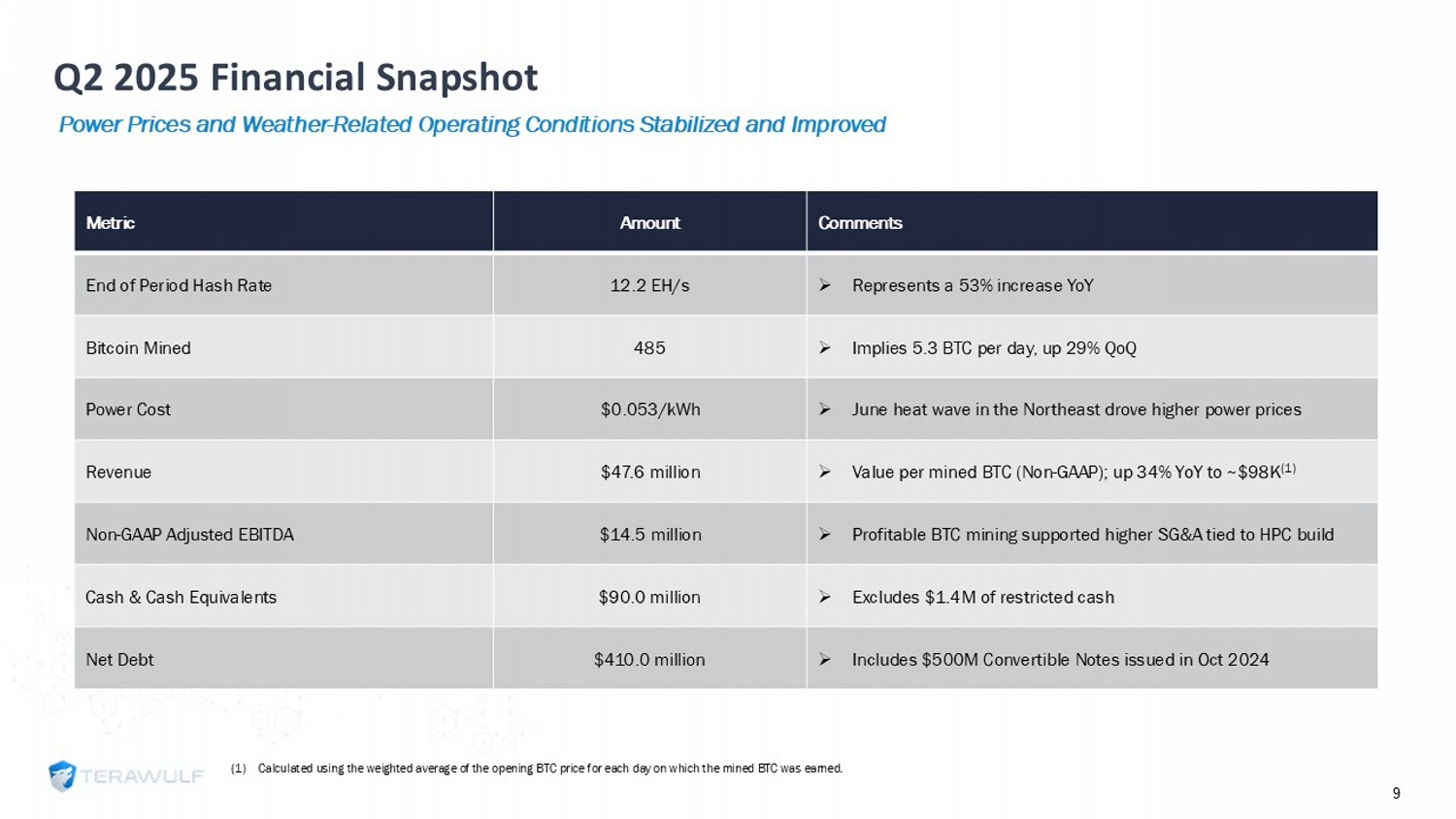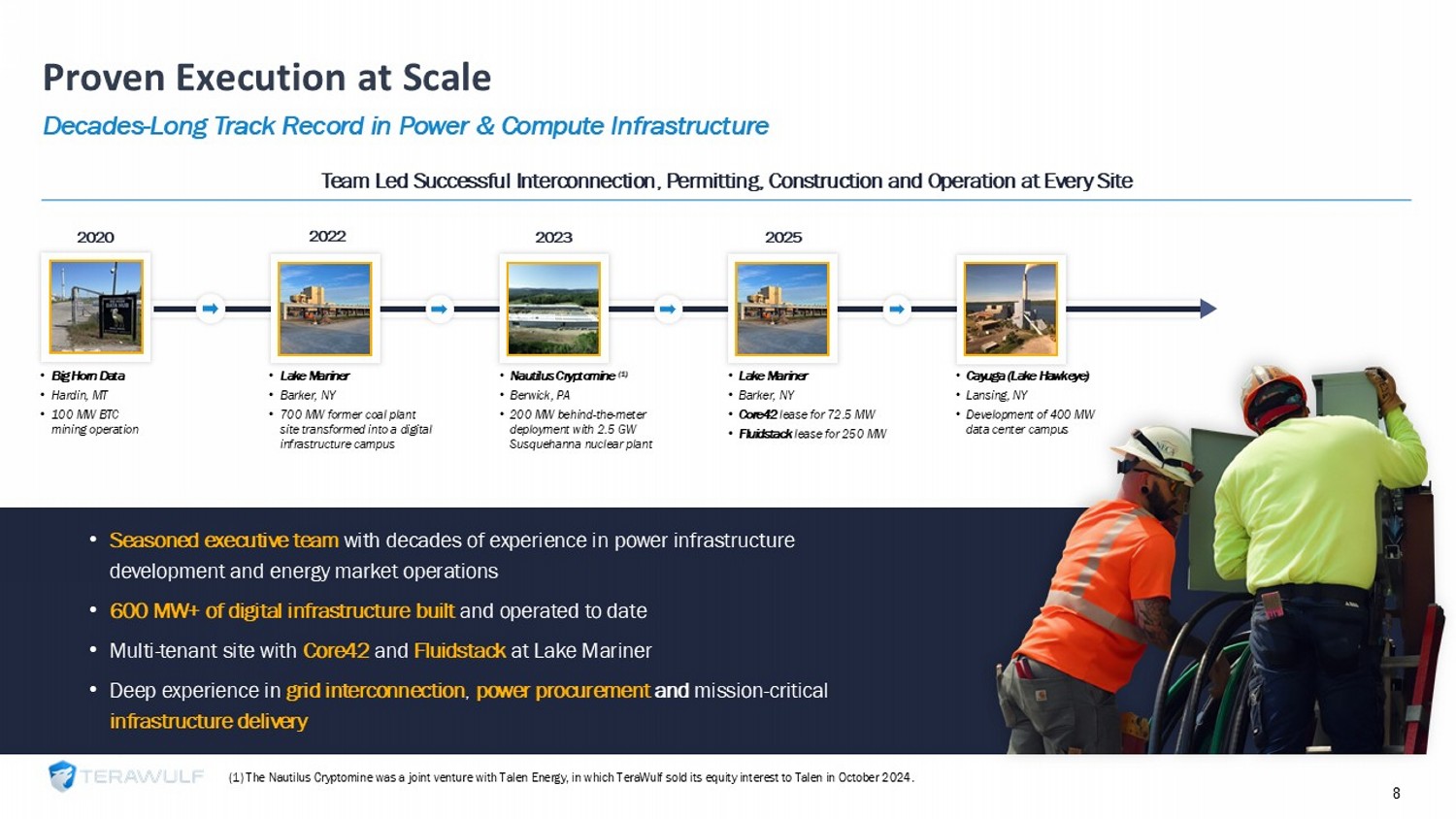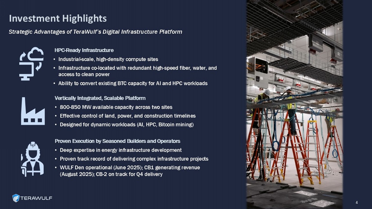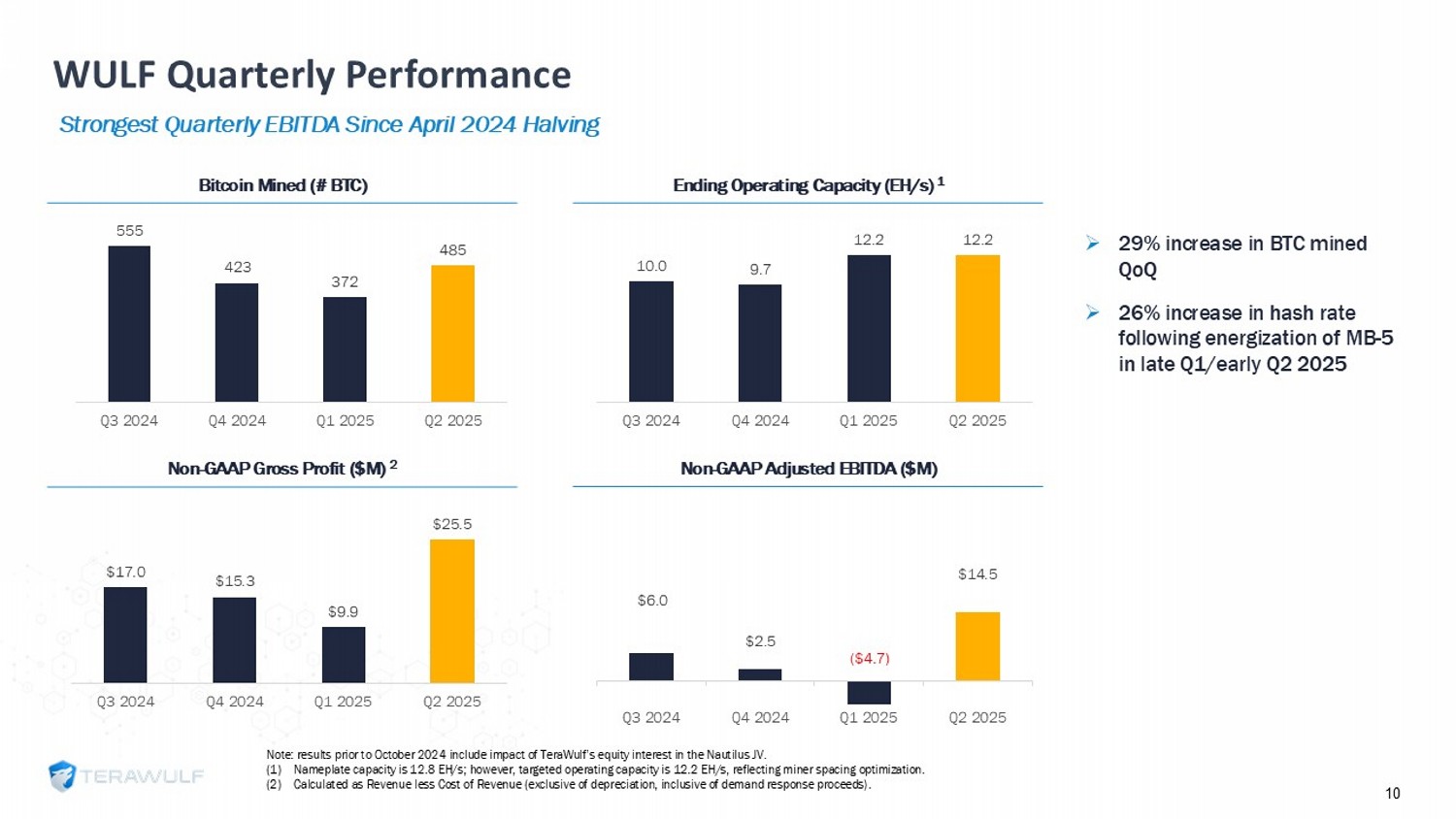 This Current Report on Form 8-K contains forward-looking statements within the meaning of the “safe harbor” provisions of the Private Securities Litigation Reform Act of 1995, as amended. Such forward-looking statements include statements concerning anticipated future events and expectations that are not historical facts. All statements, other than statements of historical fact, are statements that could be deemed forward-looking statements. In addition, forward-looking statements are typically identified by words such as “plan,” “believe,” “goal,” “target,” “aim,” “expect,” “anticipate,” “intend,” “outlook,” “estimate,” “forecast,” “project,” “seek,” “continue,” “could,” “may,” “might,” “possible,” “potential,” “strategy,” “opportunity,” “predict,” “should,” “would” and other similar words and expressions, although the absence of these words or expressions does not mean that a statement is not forward-looking. Forward-looking statements are based on the current expectations and beliefs of TeraWulf’s management and are inherently subject to a number of factors, risks, uncertainties and assumptions and their potential effects. There can be no assurance that future developments will be those that have been anticipated. Actual results may vary materially from those expressed or implied by forward-looking statements based on a number of factors, risks, uncertainties and assumptions, including, among others: (1) the ability to mine bitcoin profitably; (2) our ability to attract additional customers to lease our HPC data centers; (3) our ability to perform under our existing data center lease agreements; (4) changes in applicable laws, regulations and/or permits affecting TeraWulf’s operations or the industries in which it operates; (5) the ability to implement certain business objectives, including its bitcoin mining and HPC data center development, and to timely and cost-effectively execute related projects; (6) failure to obtain adequate financing on a timely basis and/or on acceptable terms with regard to expansion or existing operations; (7) adverse geopolitical or economic conditions, including a high inflationary environment, the implementation of new tariffs and more restrictive trade regulations; (8) the potential of cybercrime, money-laundering, malware infections and phishing and/or loss and interference as a result of equipment malfunction or break-down, physical disaster, data security breach, computer malfunction or sabotage (and the costs associated with any of the foregoing); (9) the availability and cost of power as well as electrical infrastructure equipment necessary to maintain and grow the business and operations of TeraWulf; (10) operational and financial risks associated with the expansion of the Lake Mariner data center; and (11) other risks and uncertainties detailed from time to time in the Company’s filings with the SEC. Potential investors, stockholders and other readers are cautioned not to place undue reliance on these forward-looking statements, which speak only as of the date on which they were made. TeraWulf does not assume any obligation to publicly update any forward-looking statement after it was made, whether as a result of new information, future events or otherwise, except as required by law or regulation. Investors are referred to the full discussion of risks and uncertainties associated with forward-looking statements and the discussion of risk factors contained in the Company’s filings with the SEC, which are available at www.sec.gov.