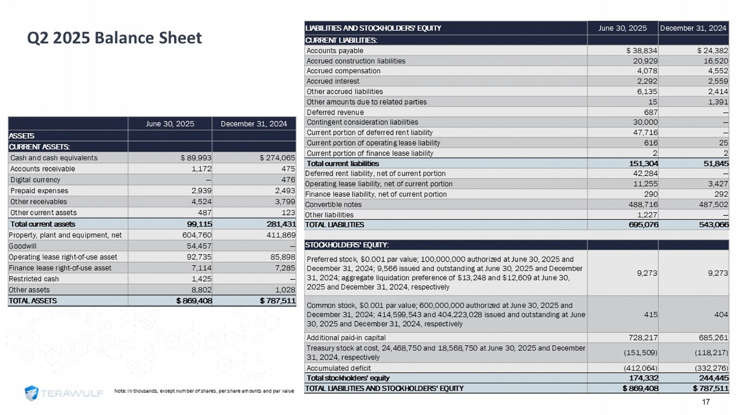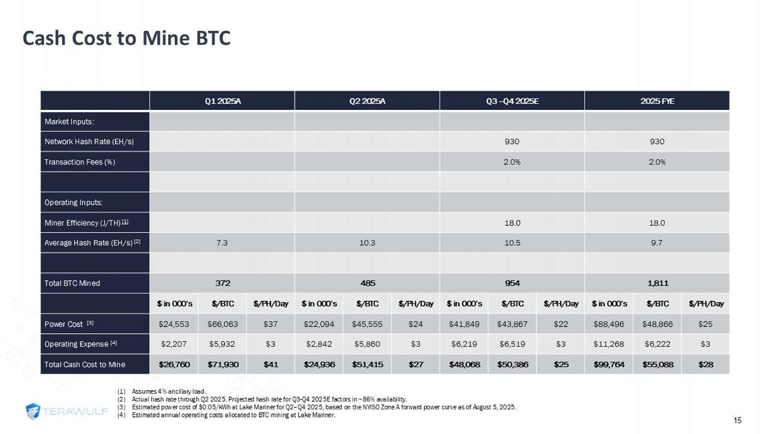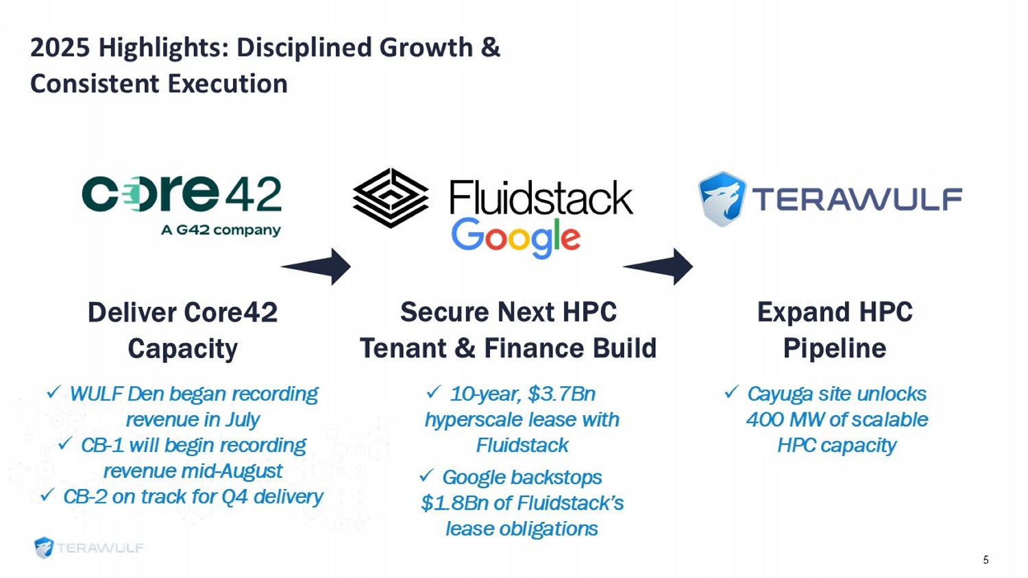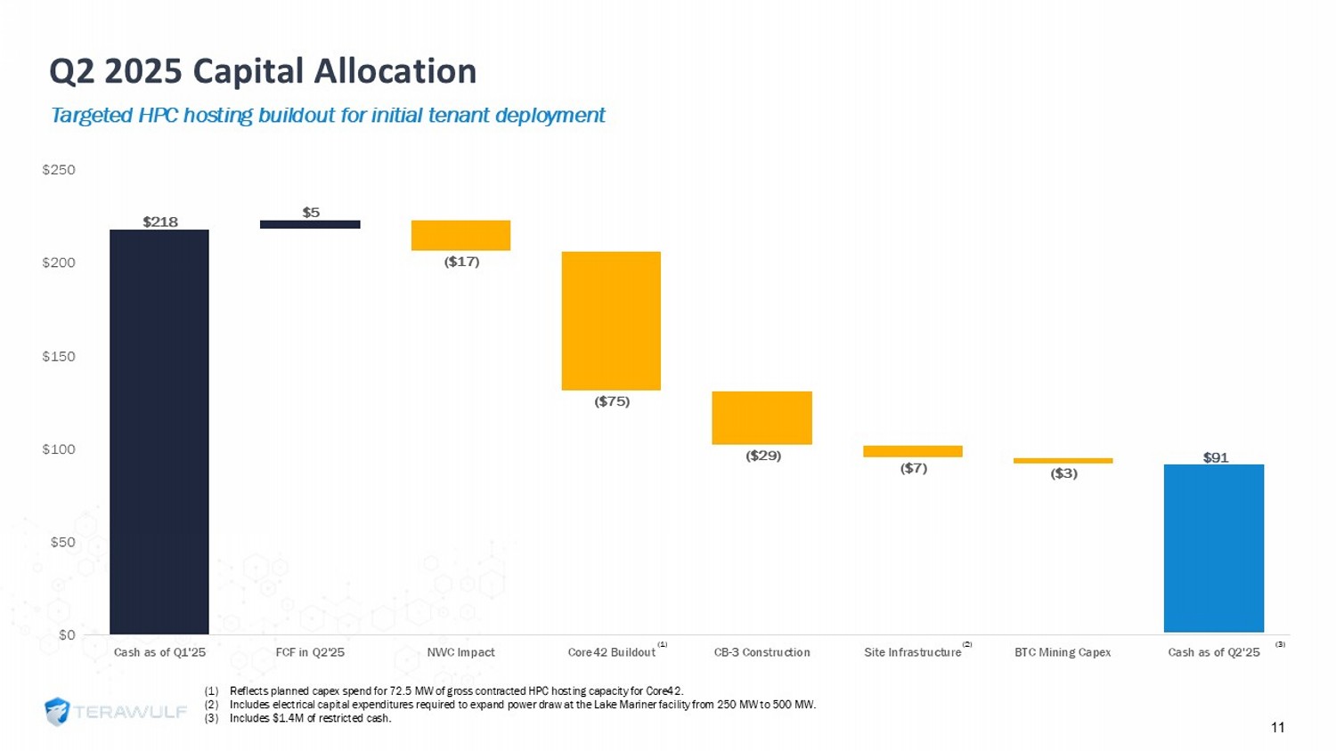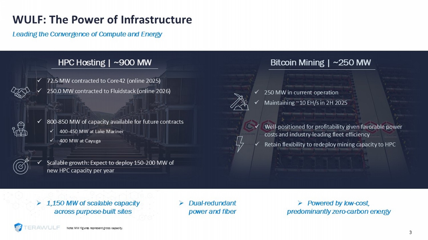 This Current Report on Form 8-K contains forward-looking statements within the meaning of the “safe harbor” provisions of the Private Securities Litigation Reform Act of 1995, as amended. Such forward-looking statements include statements concerning anticipated future events and expectations that are not historical facts. All statements, other than statements of historical fact, are statements that could be deemed forward-looking statements. In addition, forward-looking statements are typically identified by words such as “plan,” “believe,” “goal,” “target,” “aim,” “expect,” “anticipate,” “intend,” “outlook,” “estimate,” “forecast,” “project,” “seek,” “continue,” “could,” “may,” “might,” “possible,” “potential,” “strategy,” “opportunity,” “predict,” “should,” “would” and other similar words and expressions, although the absence of these words or expressions does not mean that a statement is not forward-looking. Forward-looking statements are based on the current expectations and beliefs of TeraWulf’s management and are inherently subject to a number of factors, risks, uncertainties and assumptions and their potential effects. There can be no assurance that future developments will be those that have been anticipated. Actual results may vary materially from those expressed or implied by forward-looking statements based on a number of factors, risks, uncertainties and assumptions, including, among others: (1) the ability to mine bitcoin profitably; (2) our ability to attract additional customers to lease our HPC data centers; (3) our ability to perform under our existing data center lease agreements; (4) changes in applicable laws, regulations and/or permits affecting TeraWulf’s operations or the industries in which it operates; (5) the ability to implement certain business objectives, including its bitcoin mining and HPC data center development, and to timely and cost-effectively execute related projects; (6) failure to obtain adequate financing on a timely basis and/or on acceptable terms with regard to expansion or existing operations; (7) adverse geopolitical or economic conditions, including a high inflationary environment, the implementation of new tariffs and more restrictive trade regulations; (8) the potential of cybercrime, money-laundering, malware infections and phishing and/or loss and interference as a result of equipment malfunction or break-down, physical disaster, data security breach, computer malfunction or sabotage (and the costs associated with any of the foregoing); (9) the availability and cost of power as well as electrical infrastructure equipment necessary to maintain and grow the business and operations of TeraWulf; (10) operational and financial risks associated with the expansion of the Lake Mariner data center; and (11) other risks and uncertainties detailed from time to time in the Company’s filings with the SEC. Potential investors, stockholders and other readers are cautioned not to place undue reliance on these forward-looking statements, which speak only as of the date on which they were made. TeraWulf does not assume any obligation to publicly update any forward-looking statement after it was made, whether as a result of new information, future events or otherwise, except as required by law or regulation. Investors are referred to the full discussion of risks and uncertainties associated with forward-looking statements and the discussion of risk factors contained in the Company’s filings with the SEC, which are available at www.sec.gov.