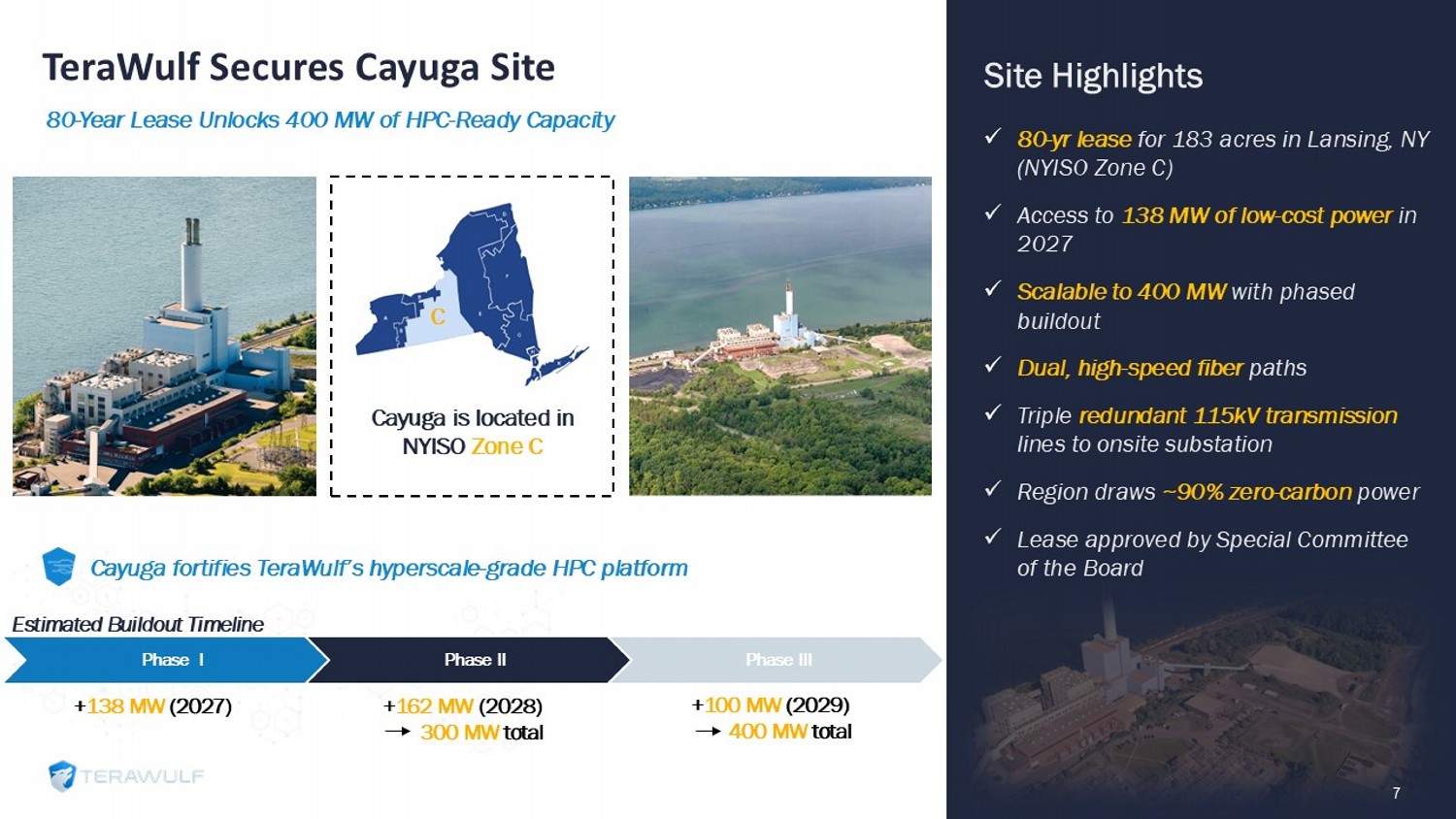 Lake Hawkeye LLC (“TW Tenant”), a Delaware limited liability company and a wholly owned subsidiary of TeraWulf Inc. (“TeraWulf” or the “Company”), Cayuga Operating Company, LLC, a Delaware limited liability company (“Cayuga Landlord”) and Riesling Power LLC, a Delaware limited liability company (“Cayuga Landlord Parent”), entered into that certain lease agreement (the “Cayuga Lease”), dated August 12, 2025 (the “Effective Date”) for a portion of Cayuga Landlord’s real property located in the Town of Lansing, New York, consisting of approximately 183 acres, including all structures, equipment, facilities and fixtures located thereon (the “Premises”). It is expected that the Premises will be used by TW Tenant and its subsidiaries primarily for hosting high-performance computing (“HPC”) data center operations.